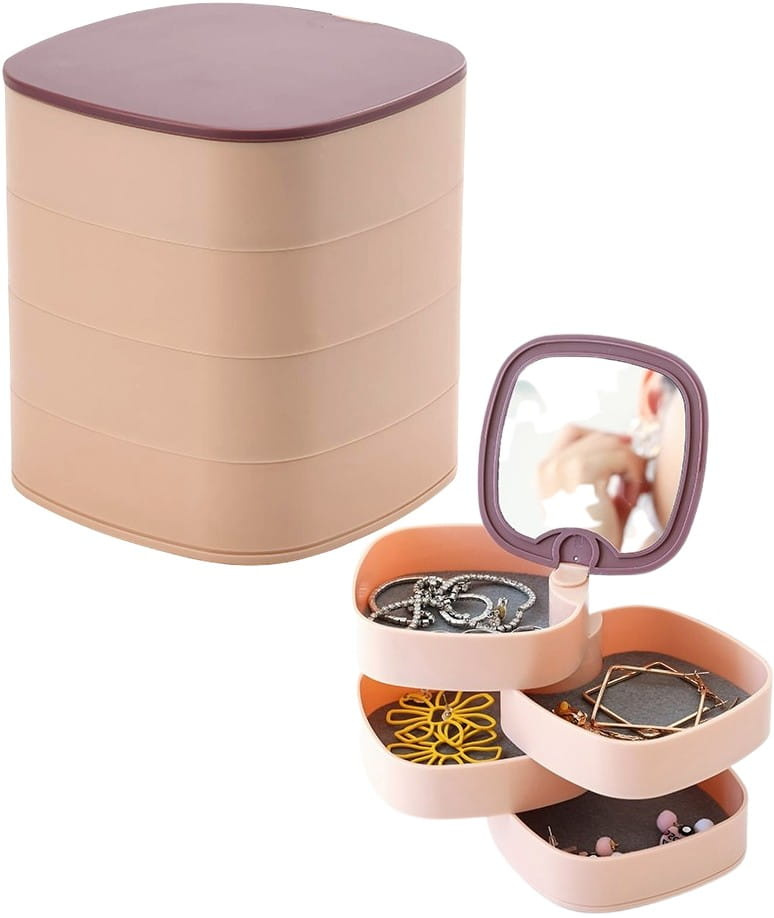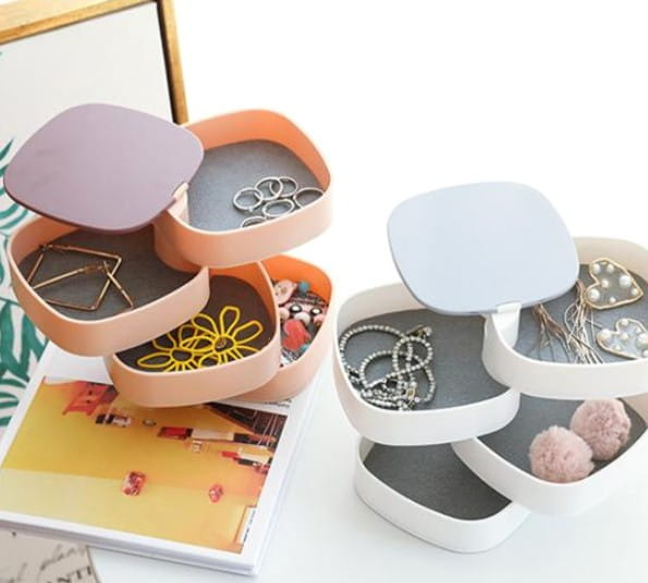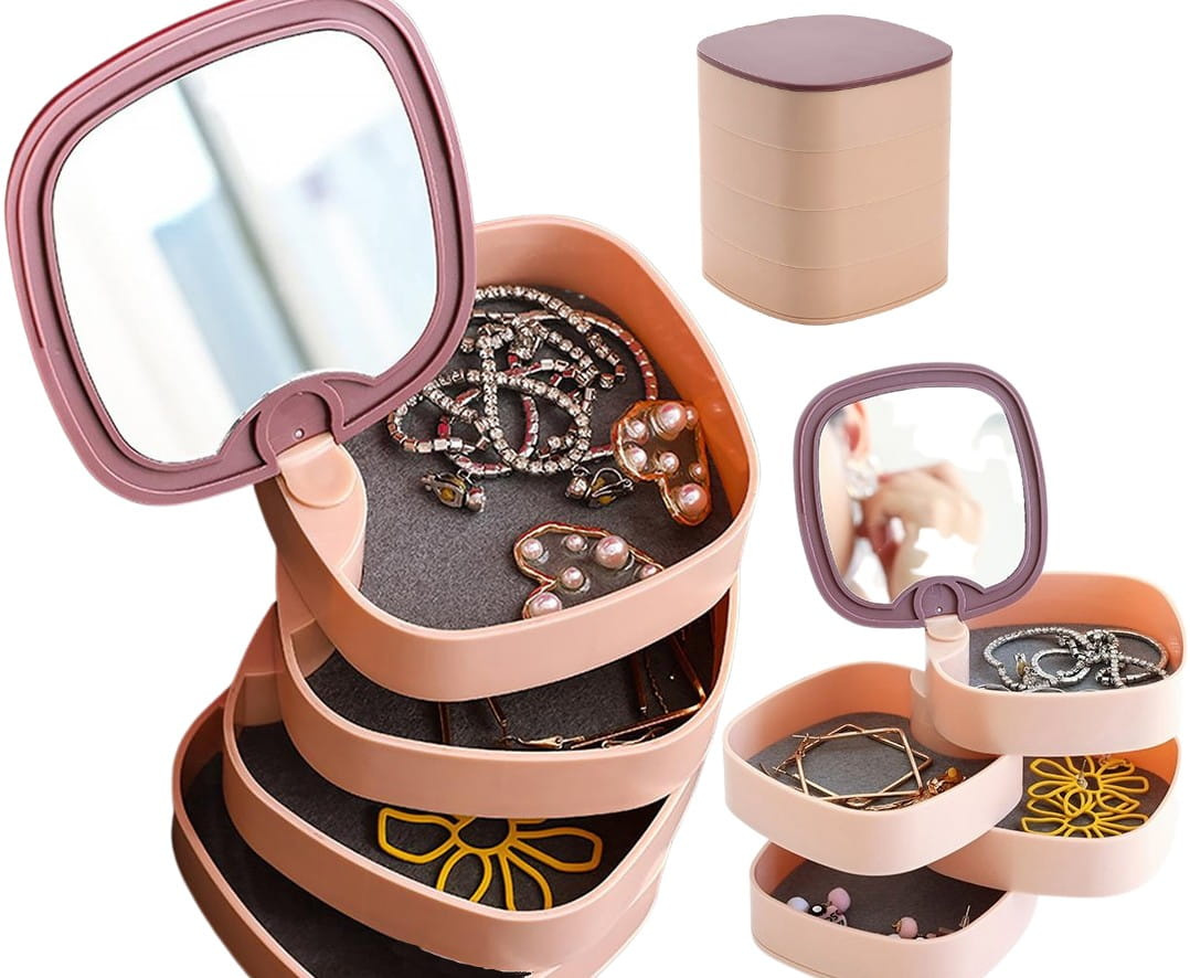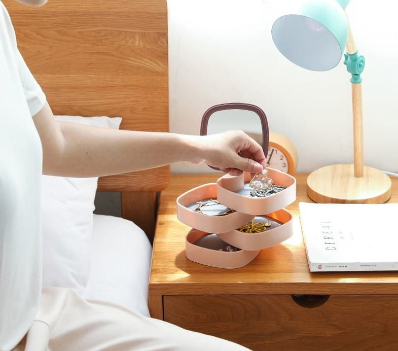 O oglindă cu mărire ușoară este atașată la capacul de dedesubt. Această cutie rotativă de depozitare a bijuteriilor este foarte practică și este o modalitate ușoară de a scoate din ea produsele de bijuterii de care aveți nevoie.