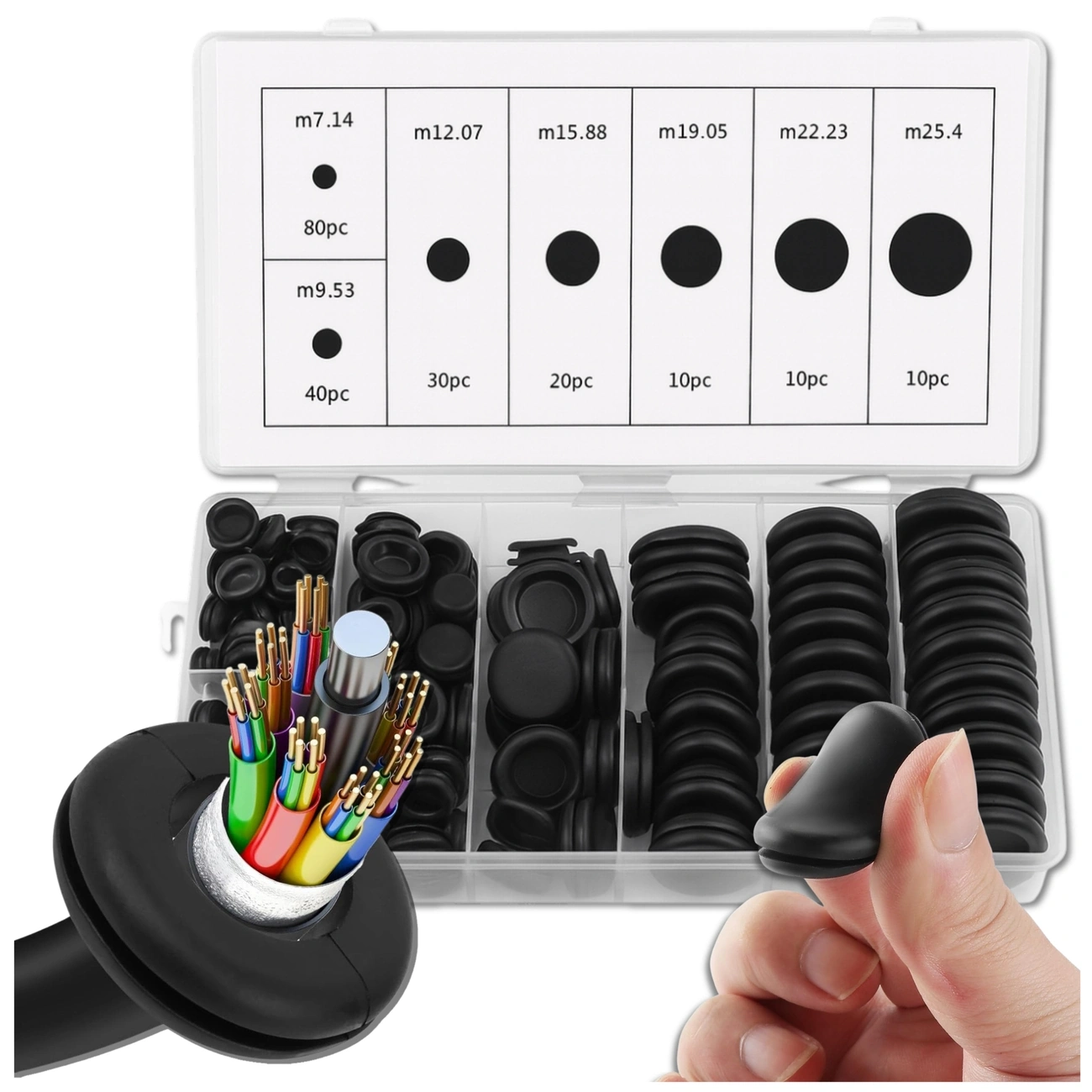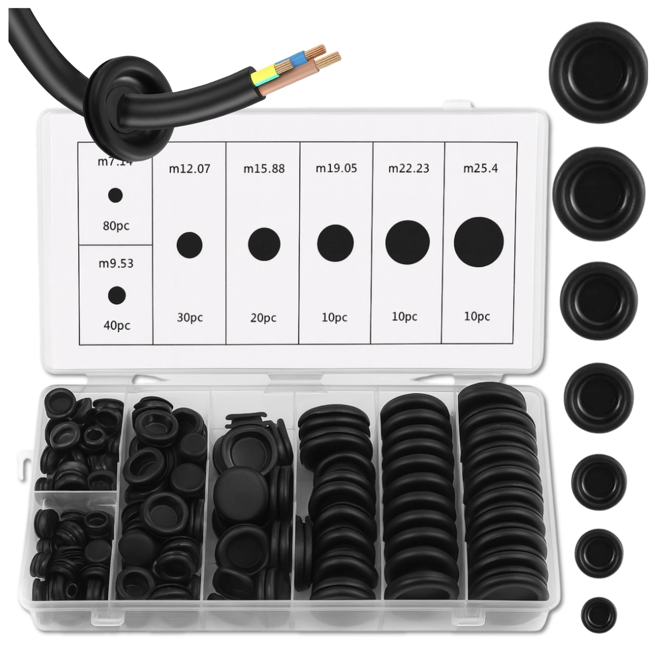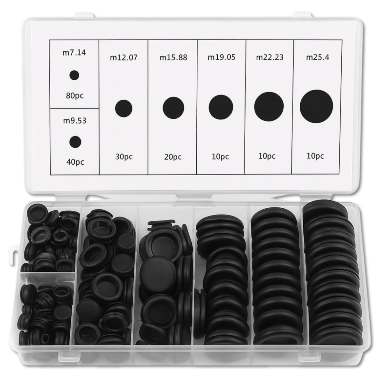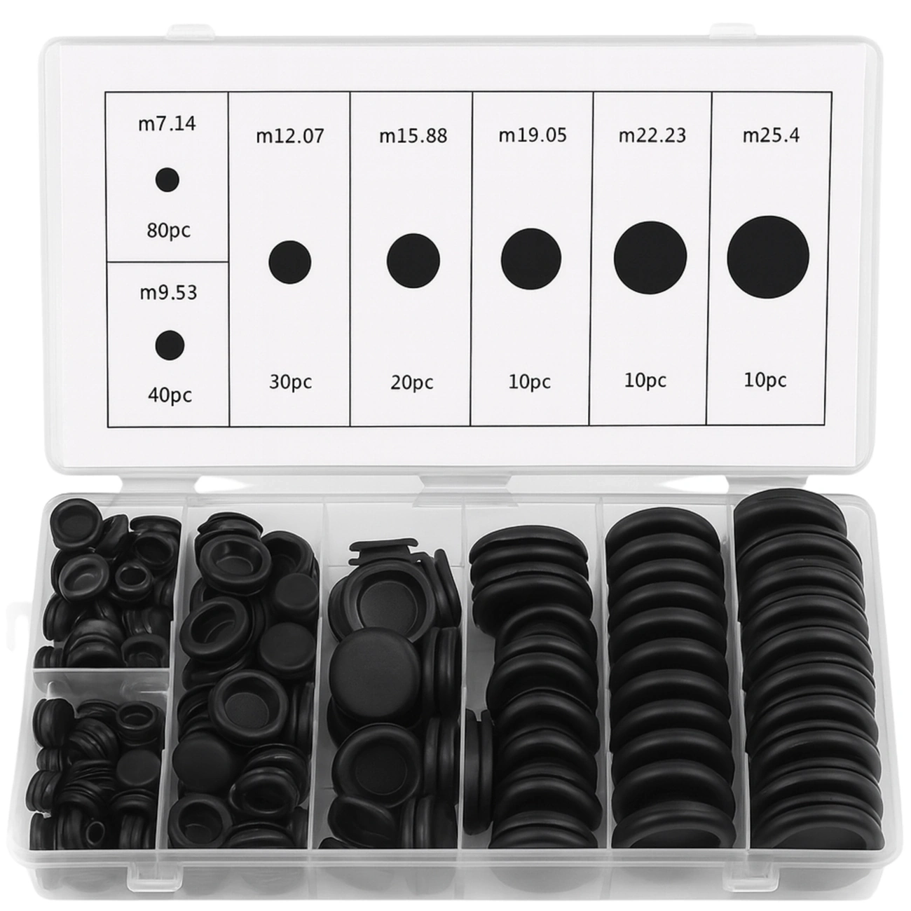 Setul include 200 de dopuri din cauciuc negru durabil, cu rezistență ridicată la temperatură și substanțe chimice. Materialul rămâne flexibil chiar și după utilizare îndelungată, asigurând o potrivire perfectă la diferite diametre de găuri și o fixare sigură și stabilă. Fiecare dimensiune este depozitată într-un compartiment separat, într-o cutie practică, care ajută la menținerea ordinii și a accesului rapid la piesa corectă, crescând confortul în muncă.
