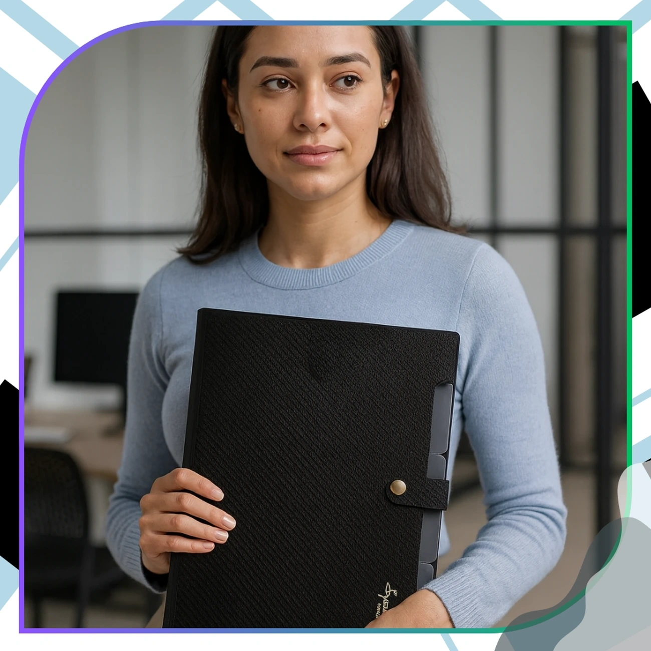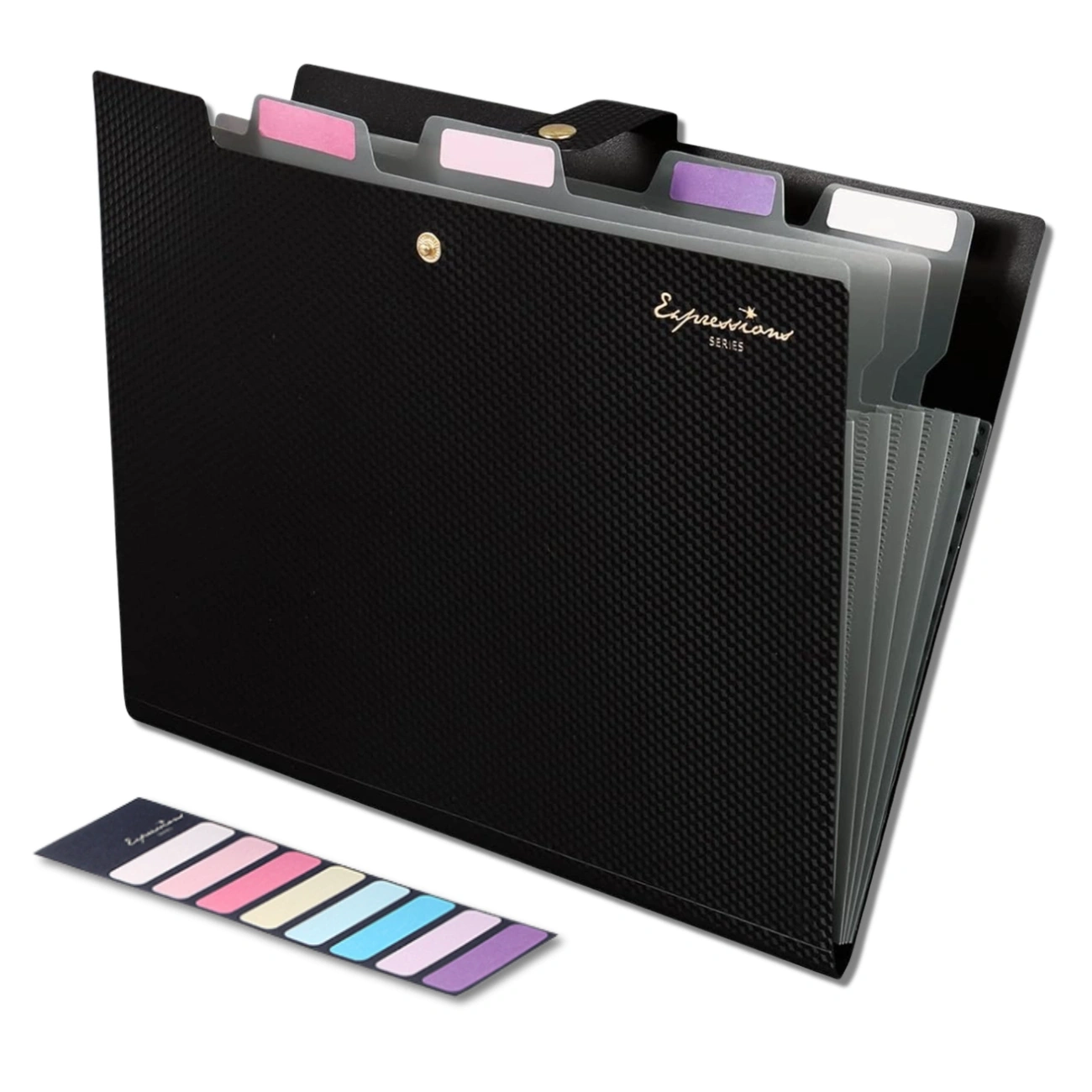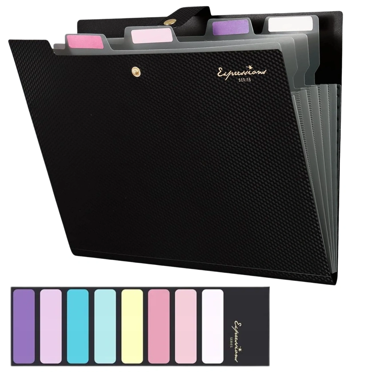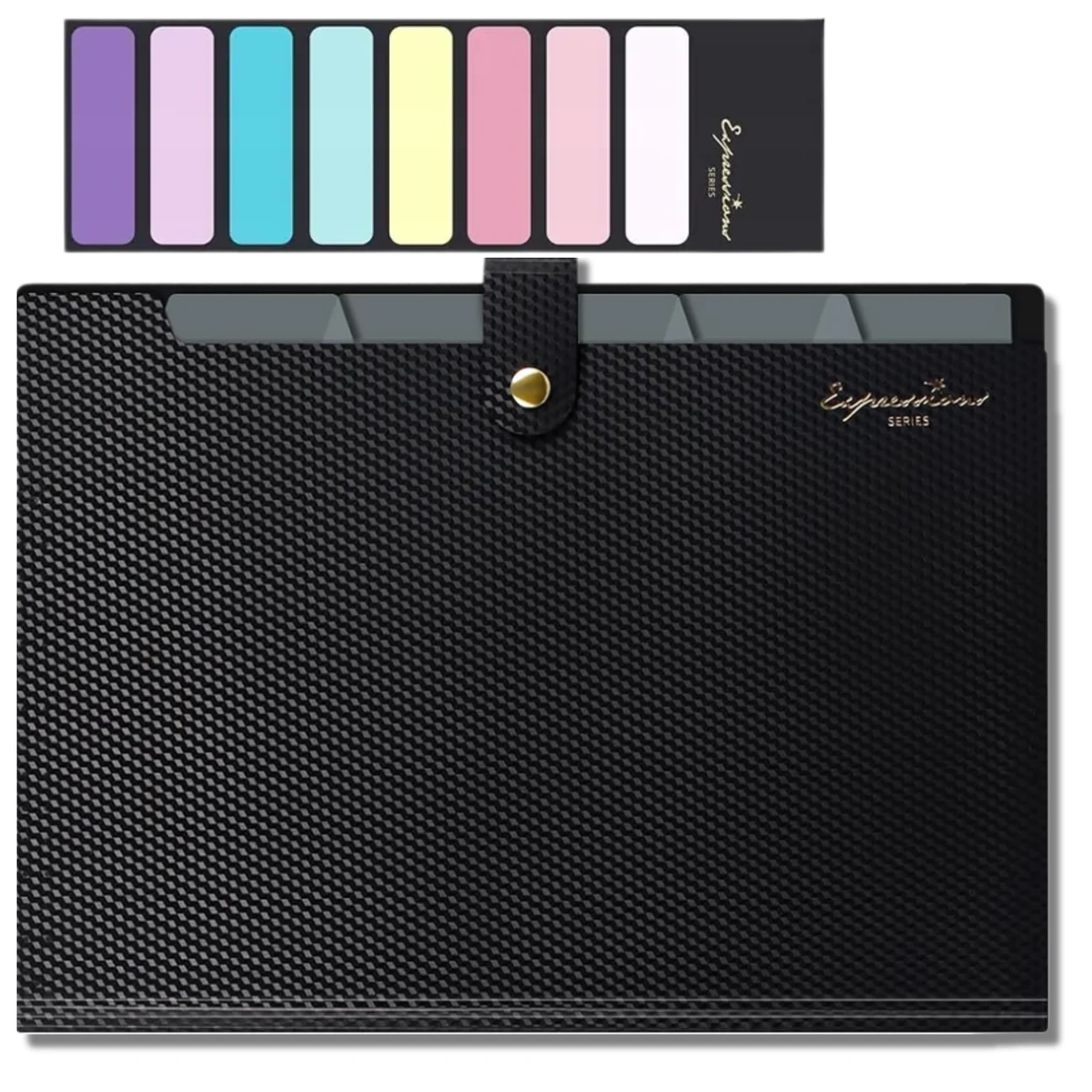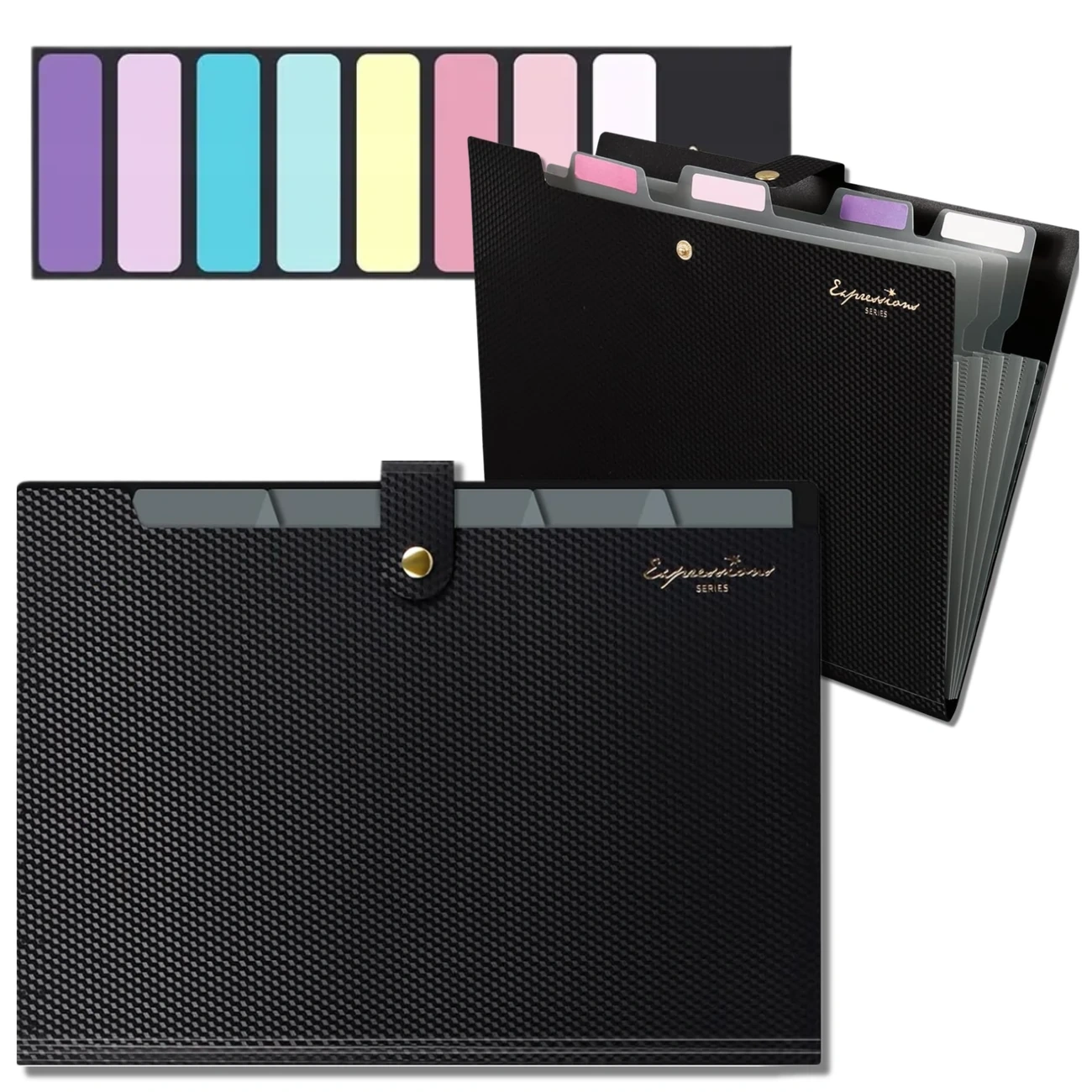 Setul include un set de clapete în diferite culori care vă permit să marcați secțiuni și să le organizați eficient. În acest fel, veți ști imediat unde se află un proiect, o notă sau un contract. Designul ușor și portabil face ca dosarul să fie ușor de încadrat într-o geantă, rucsac sau servietă, fără a adăuga greutate suplimentară bagajului.