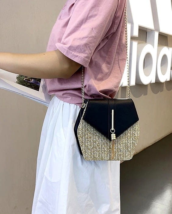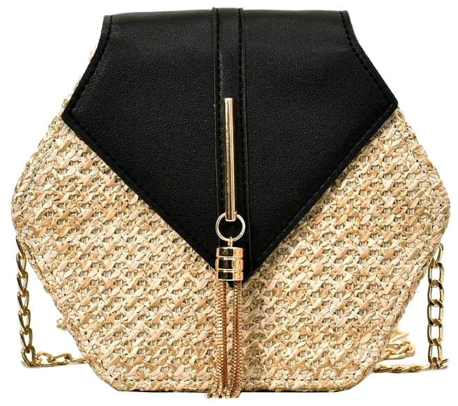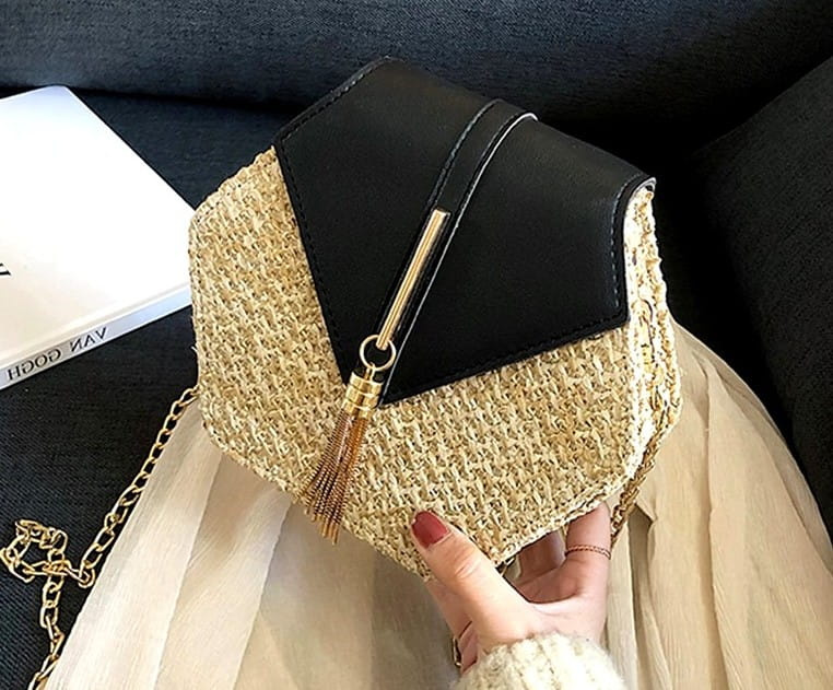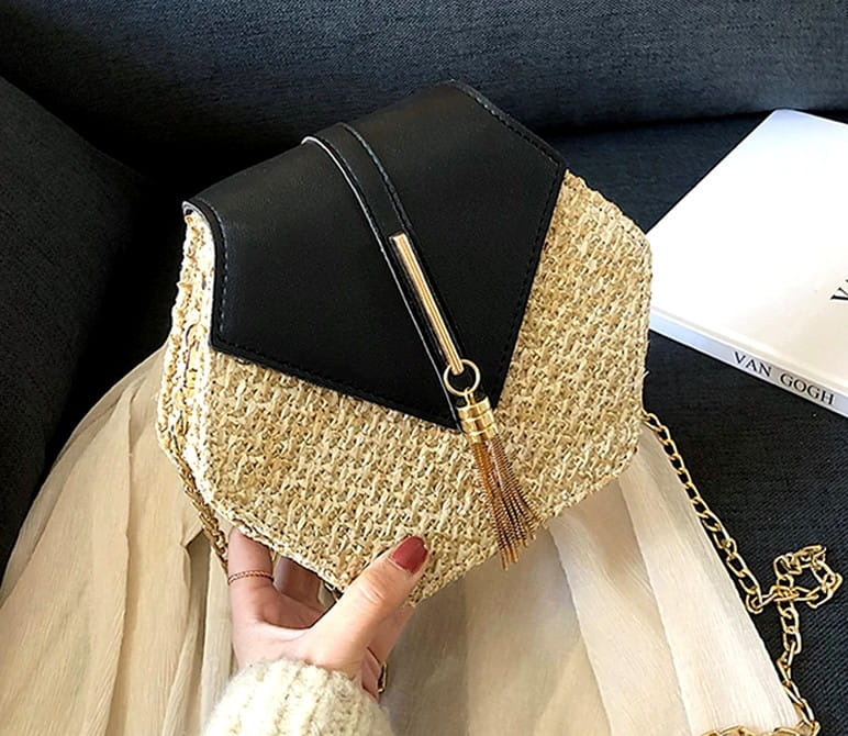 Geantă originală din paie în formă de poligon - un produs cu o curea.