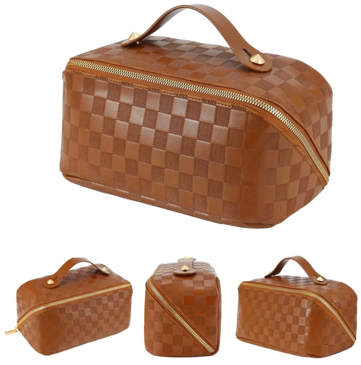 Geanta elegantă de cosmetice maro din piele ecologică măsoară 25 cm x 13 cm x 12 cm. Fundul lat și pereții rigizi, precum și mânerul confortabil, o fac, de asemenea, o alegere ideală pentru persoanele care călătoresc frecvent.