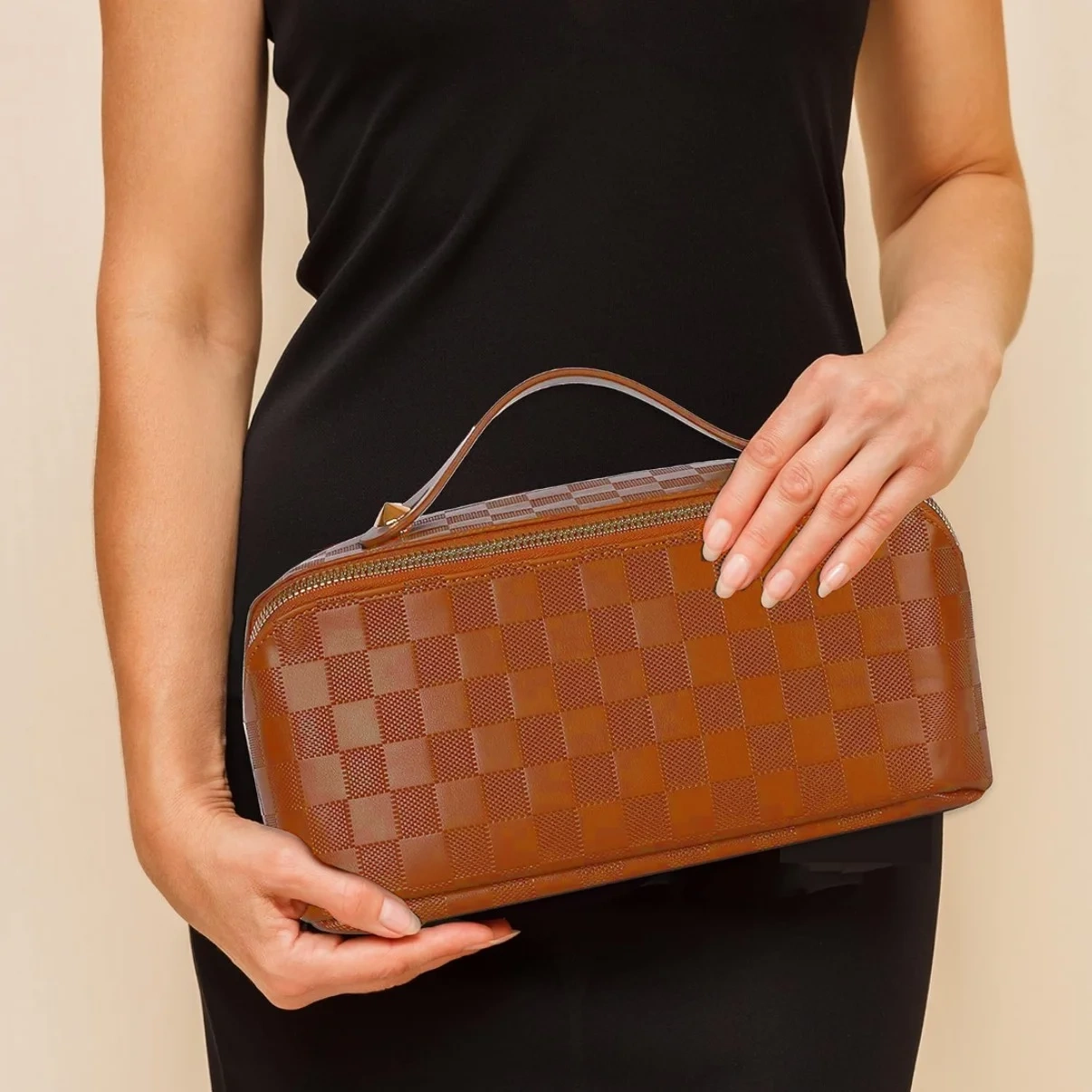 ✅ Geantă de toaletă elegantă realizată din piele ecologică de culoare maro.