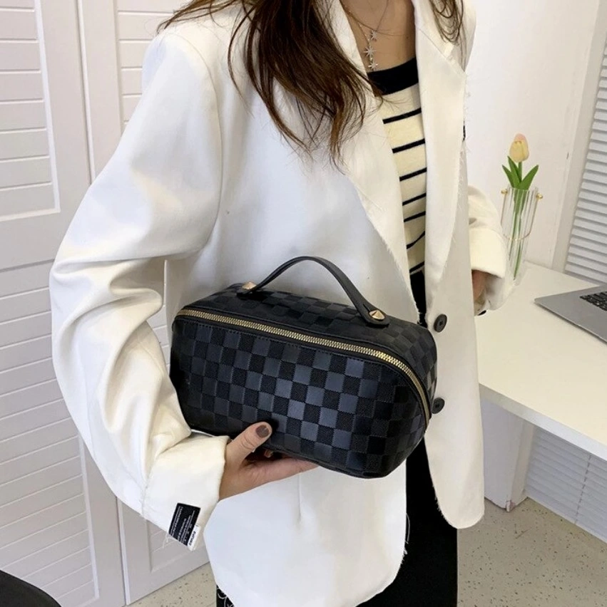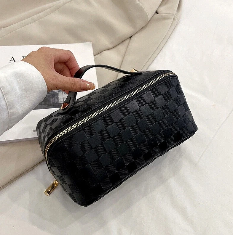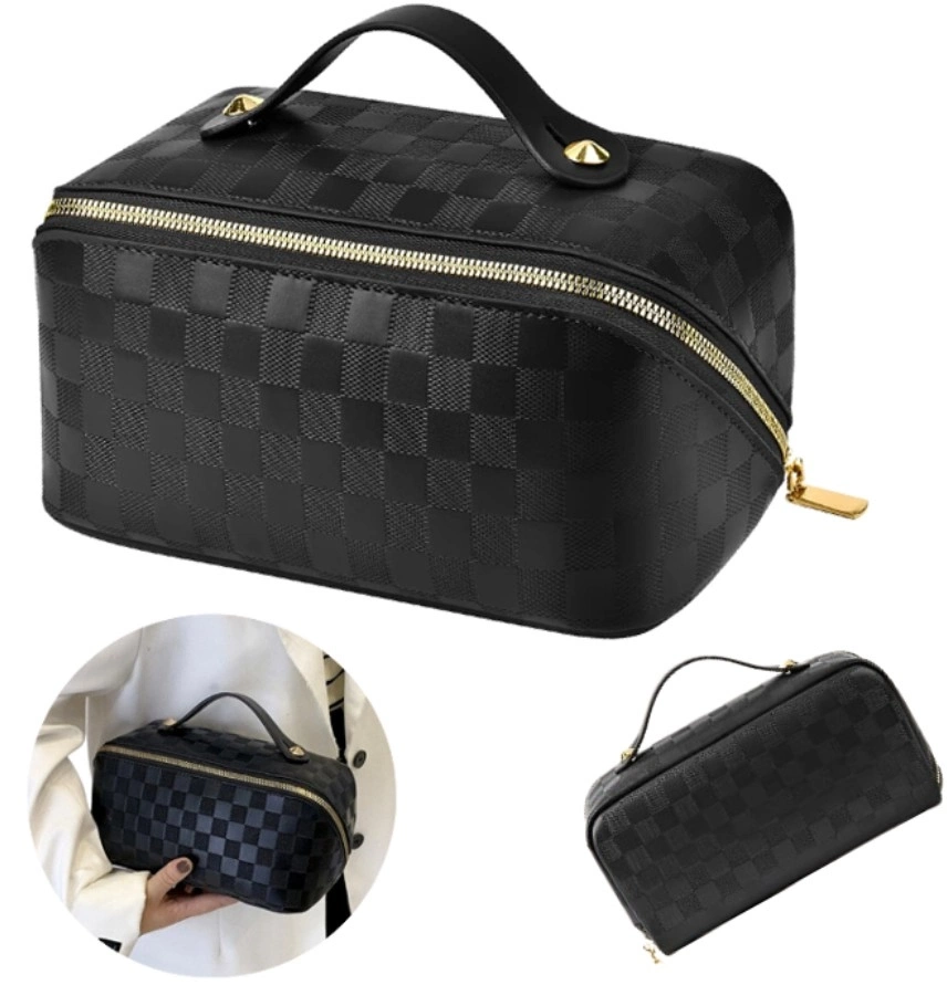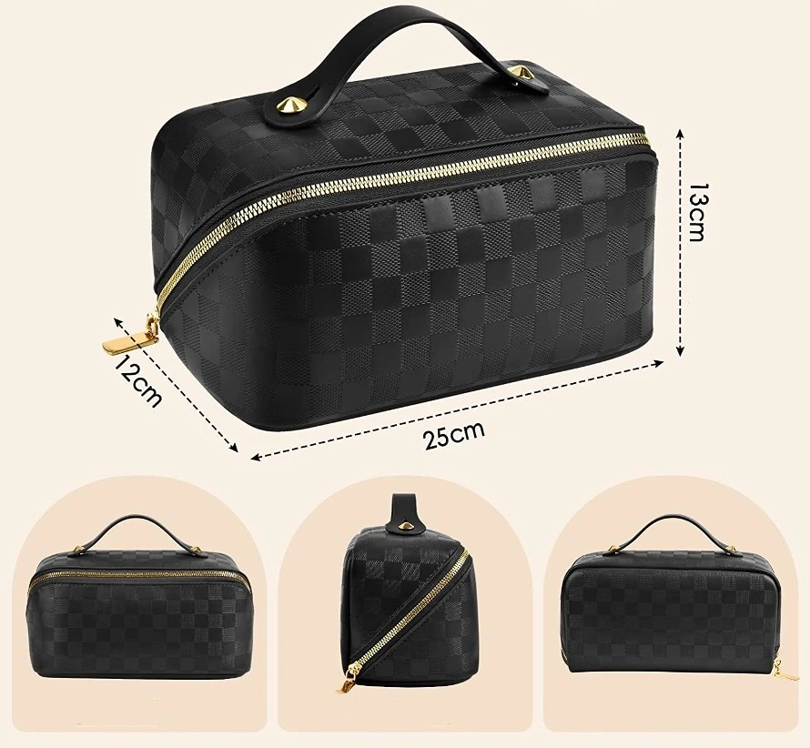 Geanta cosmetică elegantă din piele ecologică neagră este, de asemenea, o alegere ideală pentru cei care călătoresc frecvent. Datorită dimensiunii sale compacte și mânerului confortabil pentru a o ține în mână, o puteți lua cu dvs. oriunde ați merge.