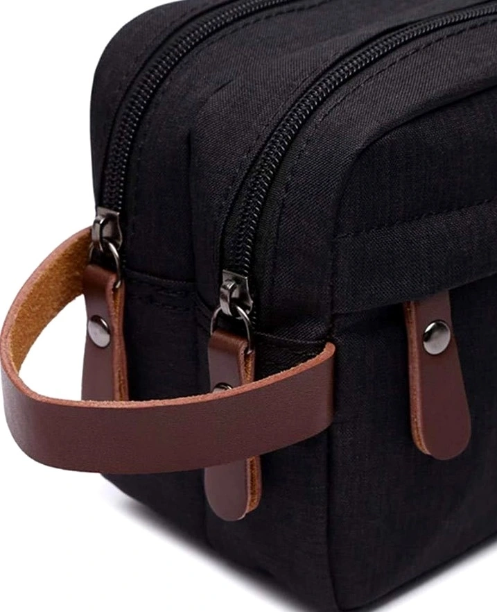 Organizatorul de genți cosmetice pentru bărbați negru, încăpător, este compact și foarte practic pentru transport. Transportarea acesteia este facilitată de un mâner robust, cusut cu grijă, din piele ecologică de culoare maro, la fel ca și capetele fermoarelor.