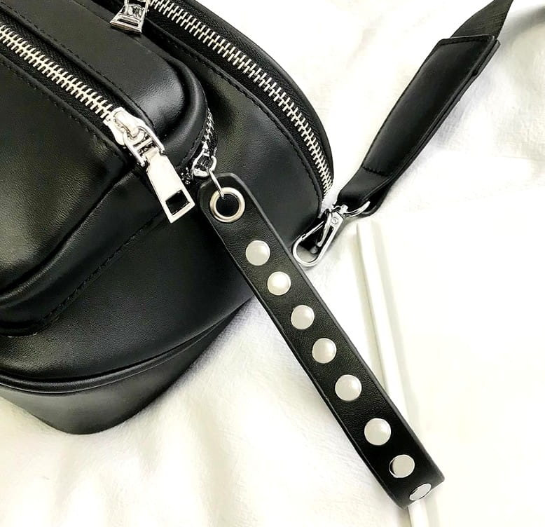 Geanta de mână din piele cu crampoane este fabricată din piele moale, ecologică. Produsul recomandat este foarte moale și plăcut la atingere. Geanta poștală din piele neagră cu curea reglabilă are două buzunare închise cu fermoar metalic. În interior poate fi găsit un alt buzunar mic cu fermoar. Feroneria din metal argintiu sporește farmecul acestui produs.