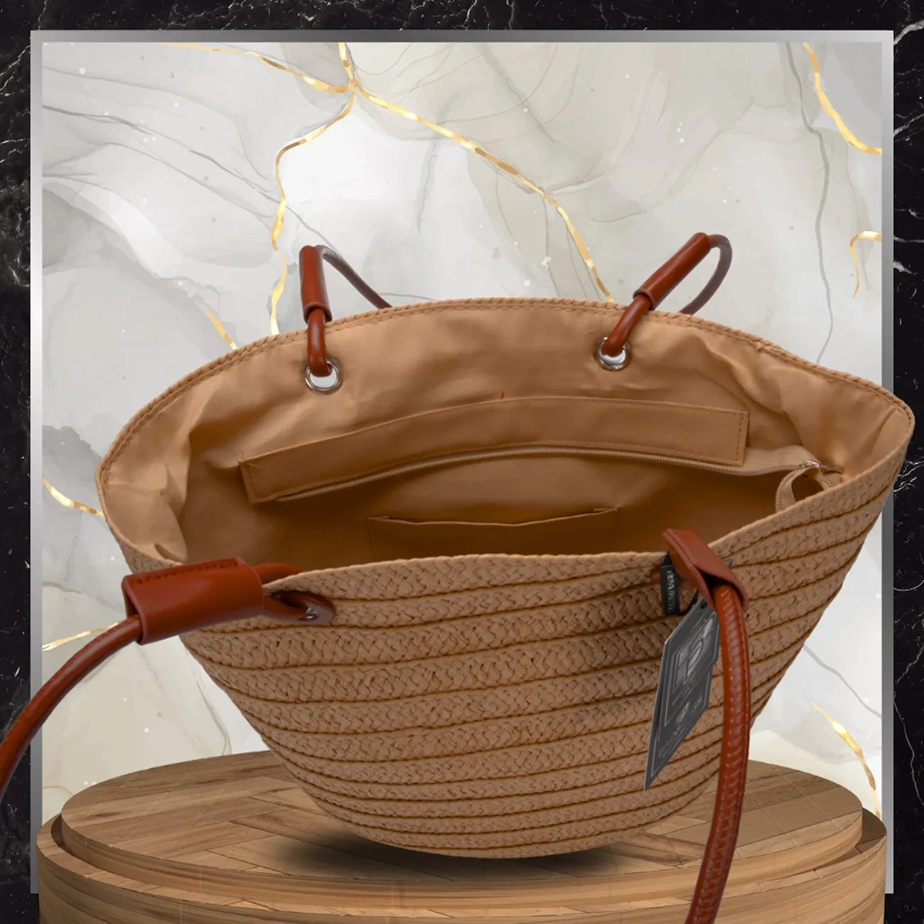 Această geantă elegantă din împletitură de înaltă calitate este alegerea perfectă pentru vară - atât pentru plajă, cât și pentru ieșirile de zi cu zi. Combină funcționalitatea și stilul natural, atrăgând privirile prin designul său clasic, cu mânere și detalii maro.