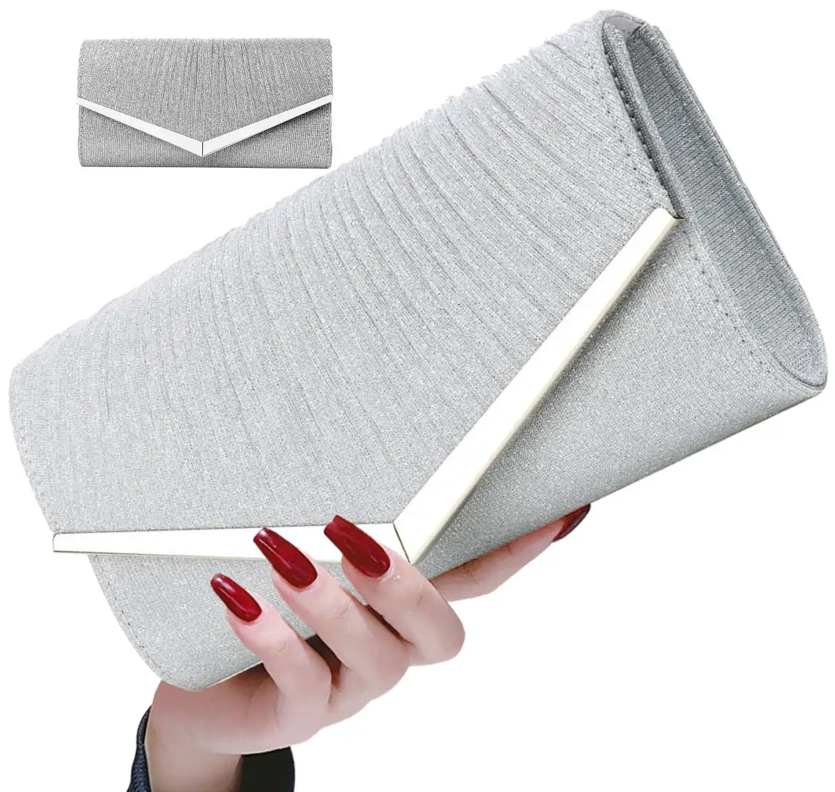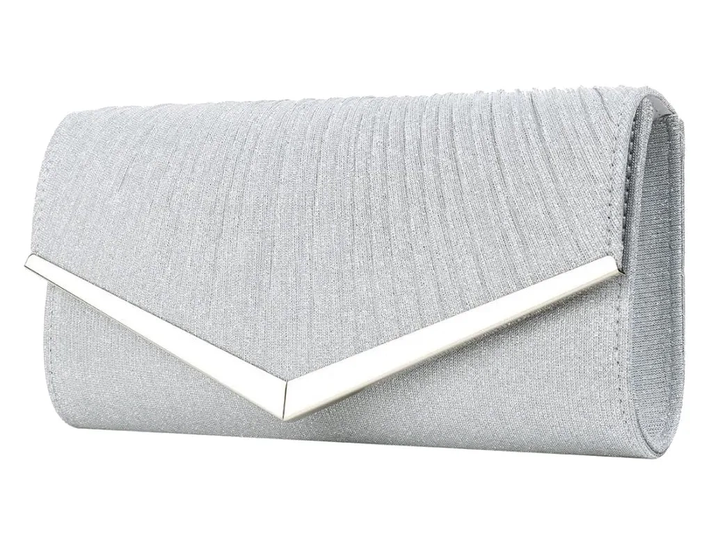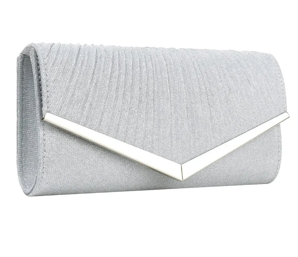 Produsul a fost special rigidizat, datorită căruia arată foarte bine. Geanta este de culoare argintie și a fost decorată cu încrețituri fine. Sclipiciul de pe suprafața produsului strălucește excepțional de frumos.