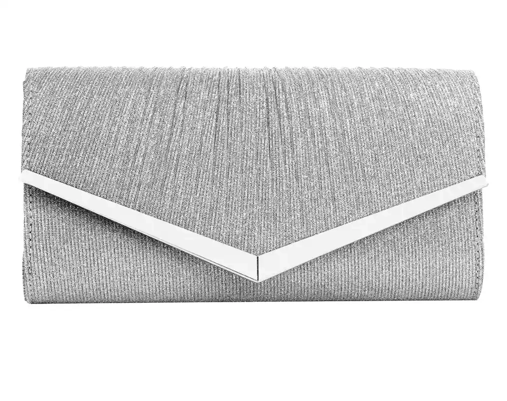 Geanta de seară elegantă pentru femei recomandată de noi are un ornament din metal argintiu plasat de-a lungul marginii frontale a clapetei genții. Acest produs de tip clutch se ține perfect în mână.