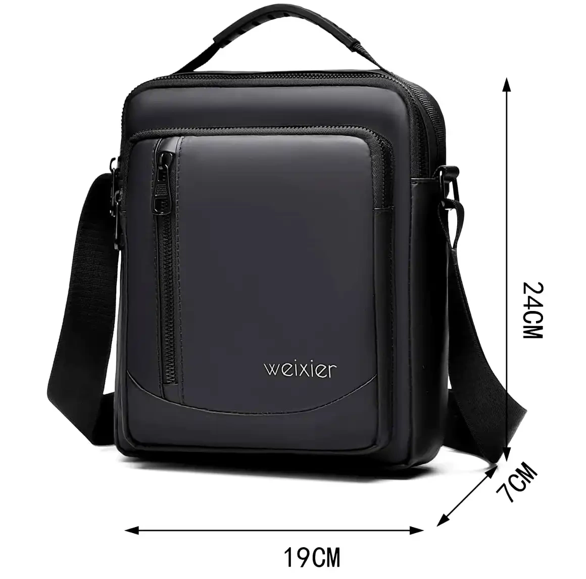 Geanta bărbătească de piele peste umăr măsoară 19 cm lățime, 24 cm înălțime și are o lățime a fundului de 7 cm.
