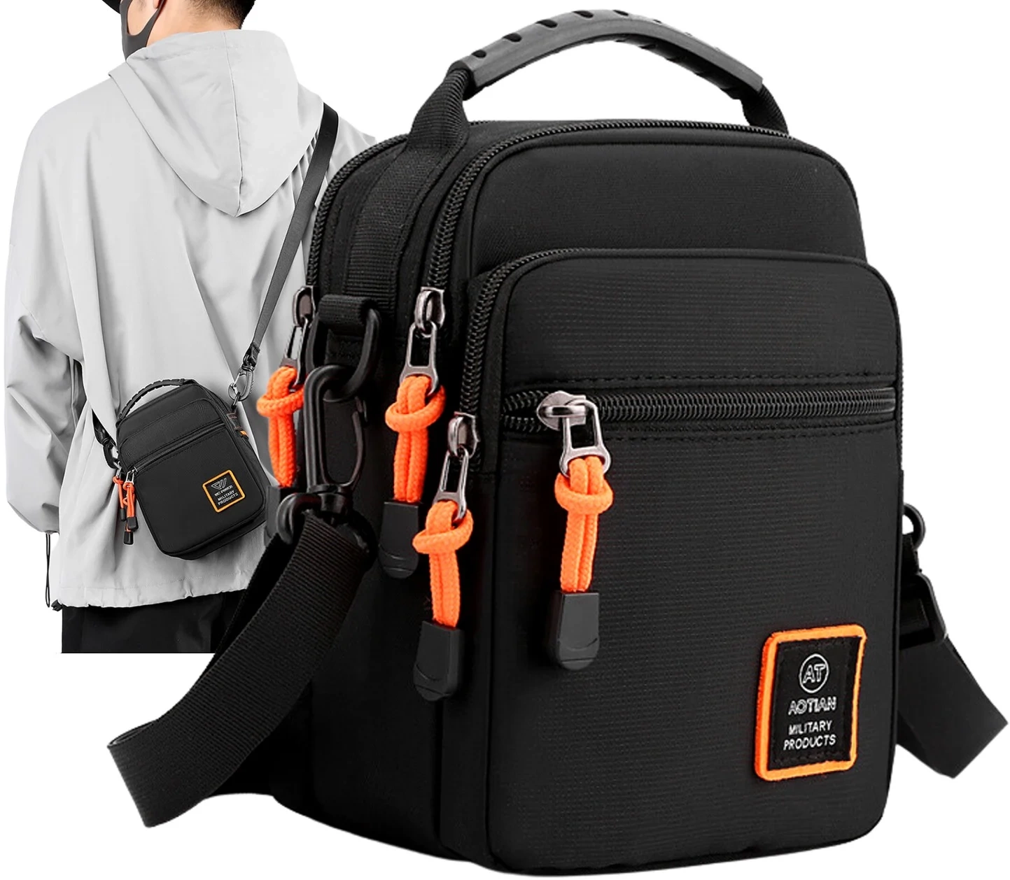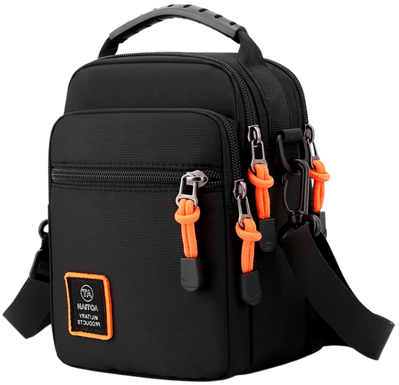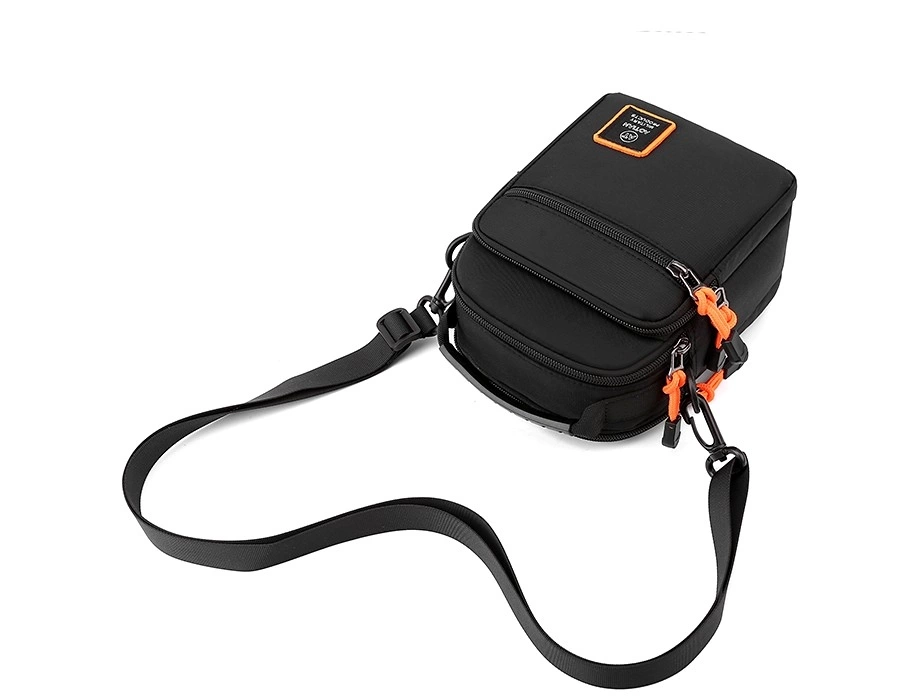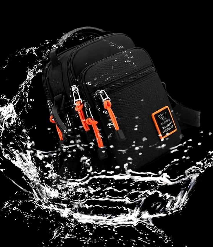 Geanta sport peste umăr impermeabilă pentru bărbați măsoară 15 cm x 20 cm x 9 cm și are 3 compartimente încăpătoare, închise cu fermoare cu cârlige de șnur de culoare portocalie.
