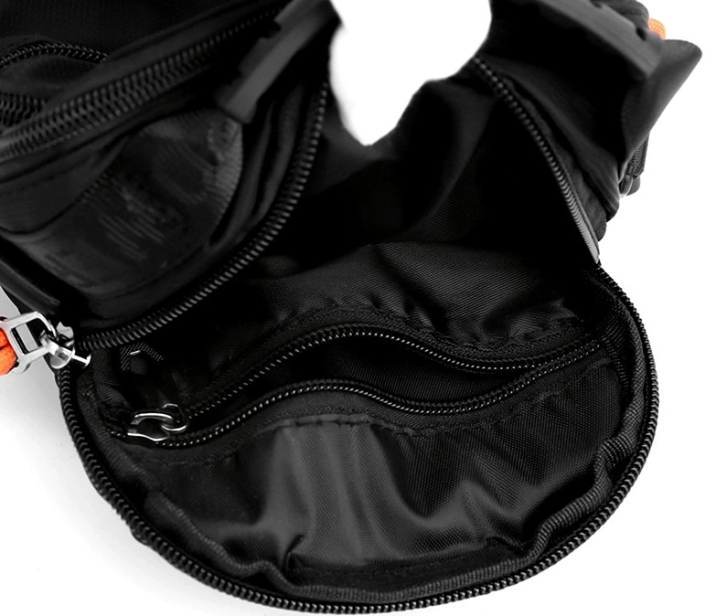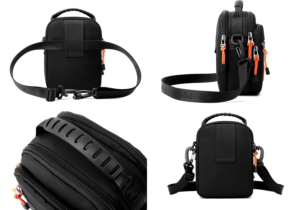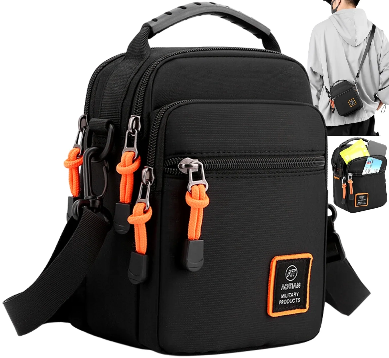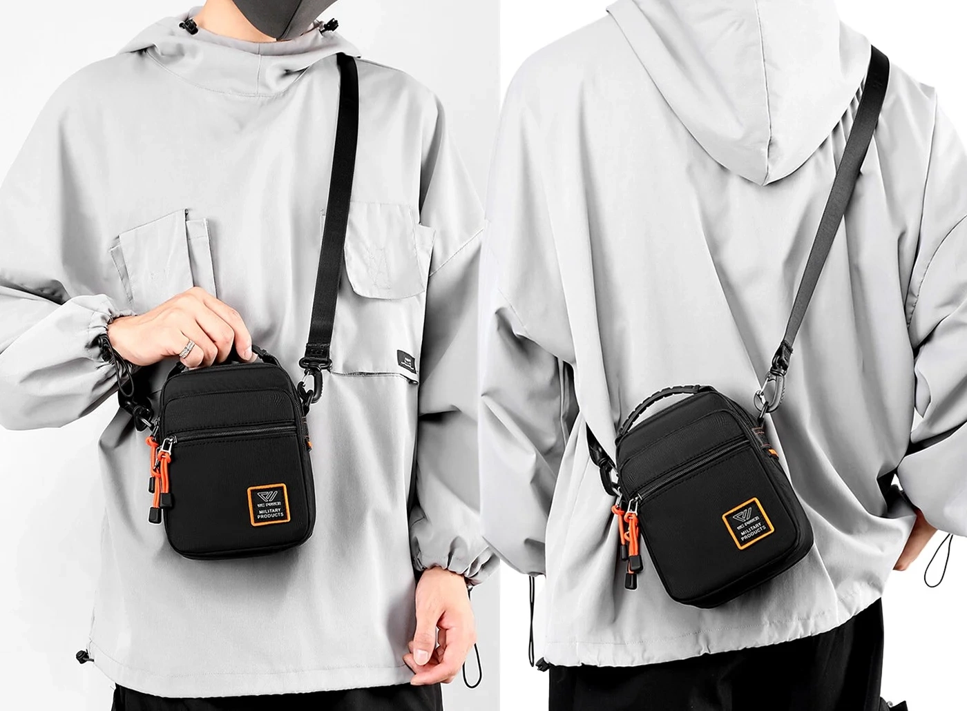 Geanta sport peste umăr impermeabilă pentru bărbați măsoară 15 cm x 20 cm x 9 cm și are 3 compartimente încăpătoare, închise cu fermoare cu cârlige de șnur de culoare portocalie.
