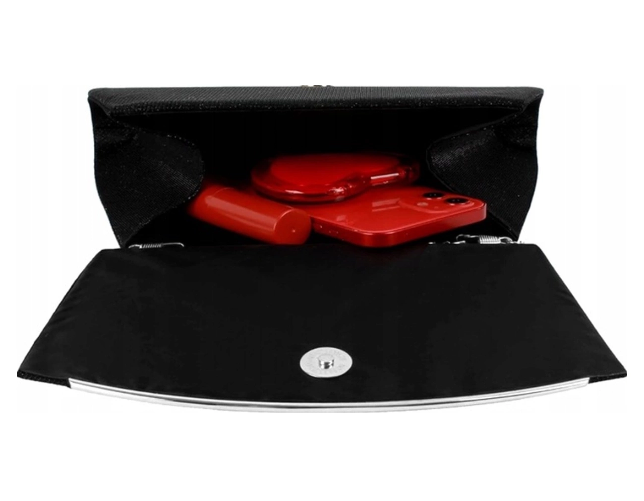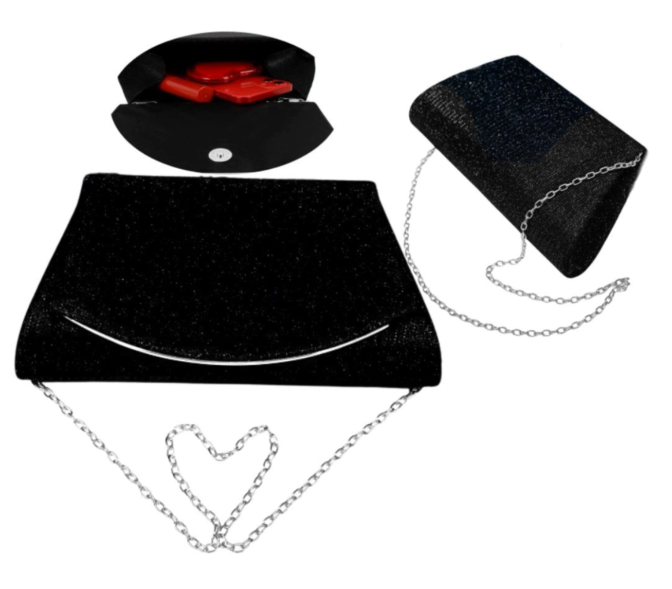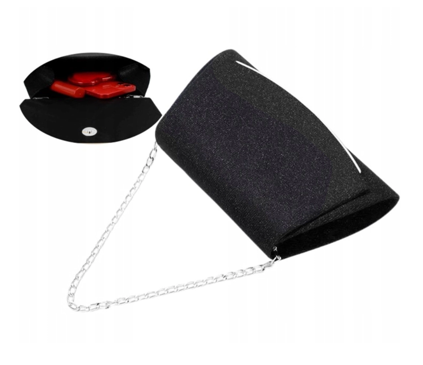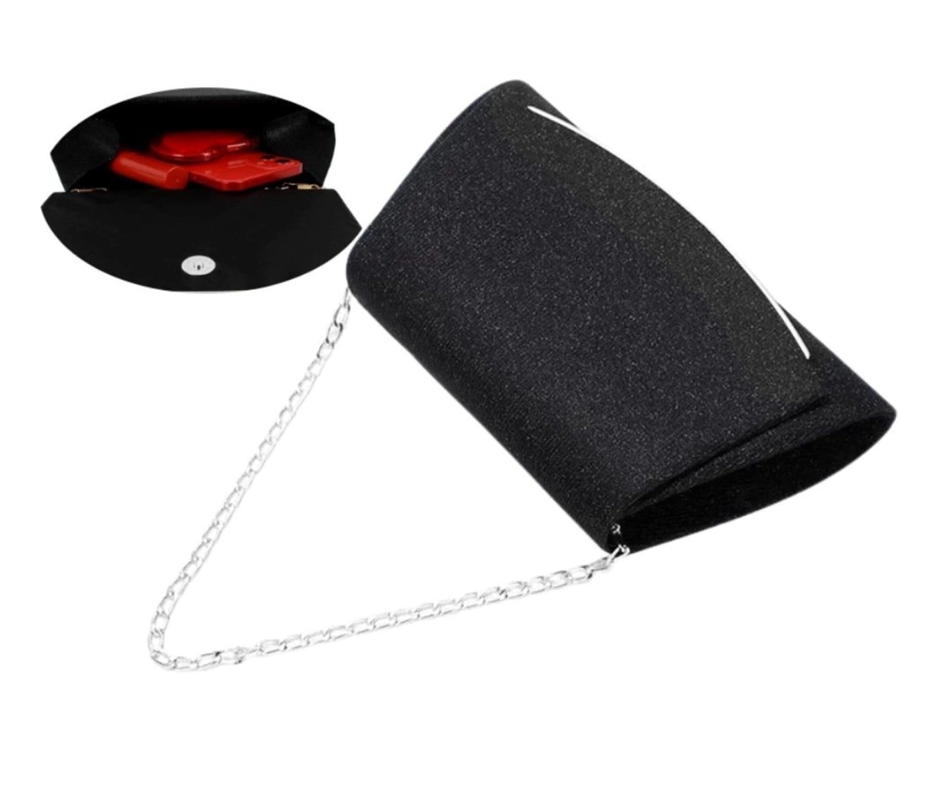 Geanta de umăr de seară pentru femei cu farmec strălucitor are un compartiment mare, fixat cu o încuietoare magnetică durabilă, din aur. Acesta va găzdui un telefon mobil și alte obiecte mici. Există, de asemenea, un buzunar mic deschis în interior, ideal pentru o batistă, de exemplu.