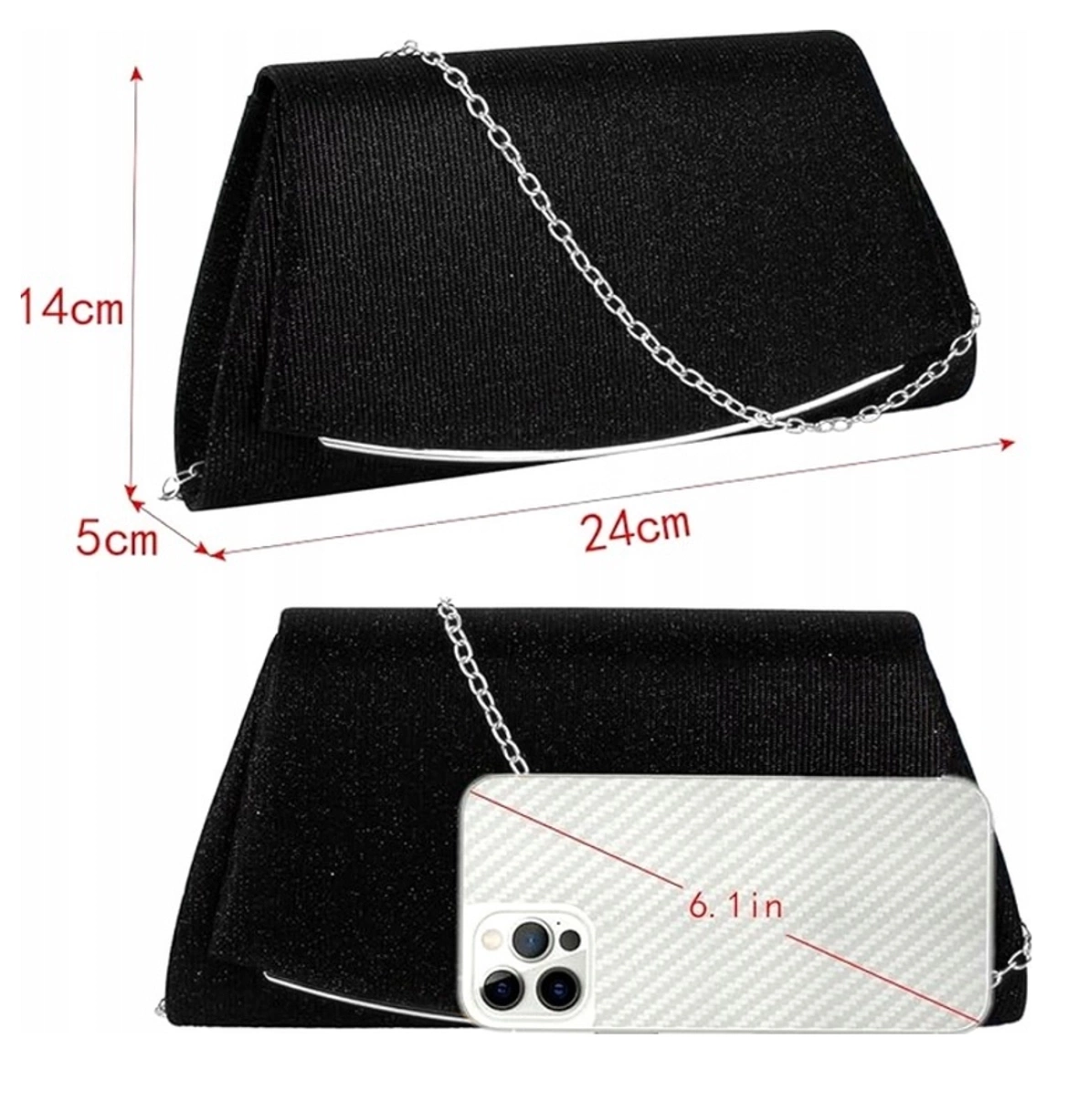 Înălțimea totală a genții este de 14 cm, iar lățimea este de 24 cm. Fundul este lat de 5,5 cm. Produsul poate fi purtat, de asemenea, pe un lanț lung de 100 cm, care este ușor de atașat cu cârlige de metal.