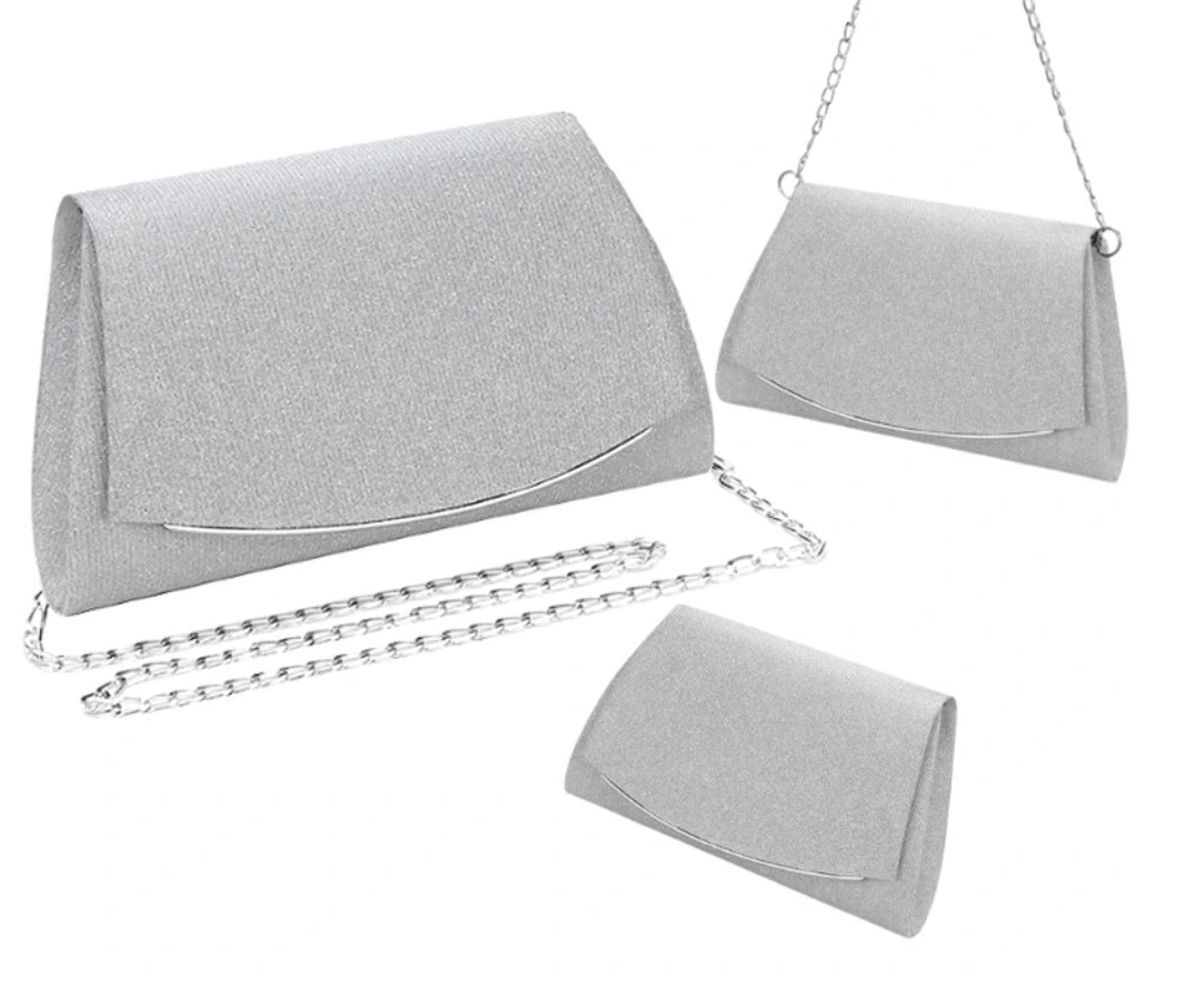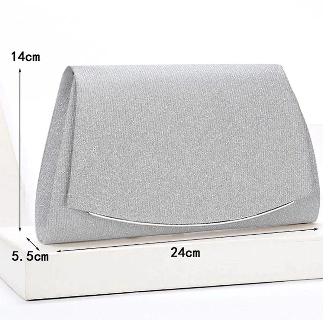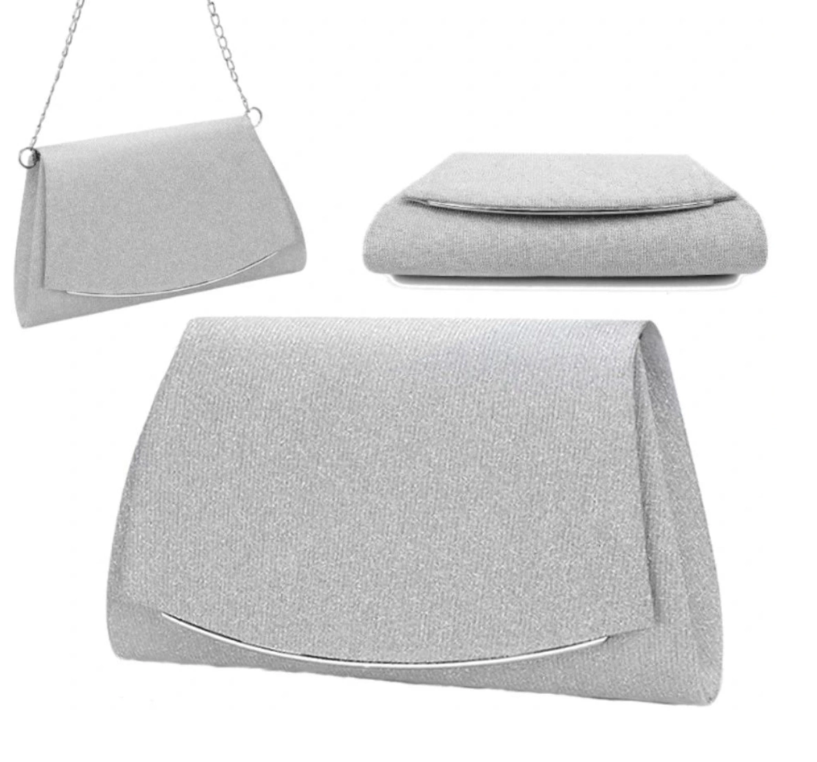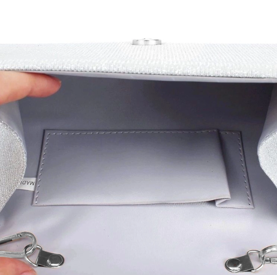 Partea superioară a produsului este decorată cu hardware metalic. Geanta de seară elegantă pentru femei cu sclipici are un compartiment mare, fixat cu o încuietoare magnetică. În interior, există un buzunar mic deschis care poate găzdui diverse obiecte mici.