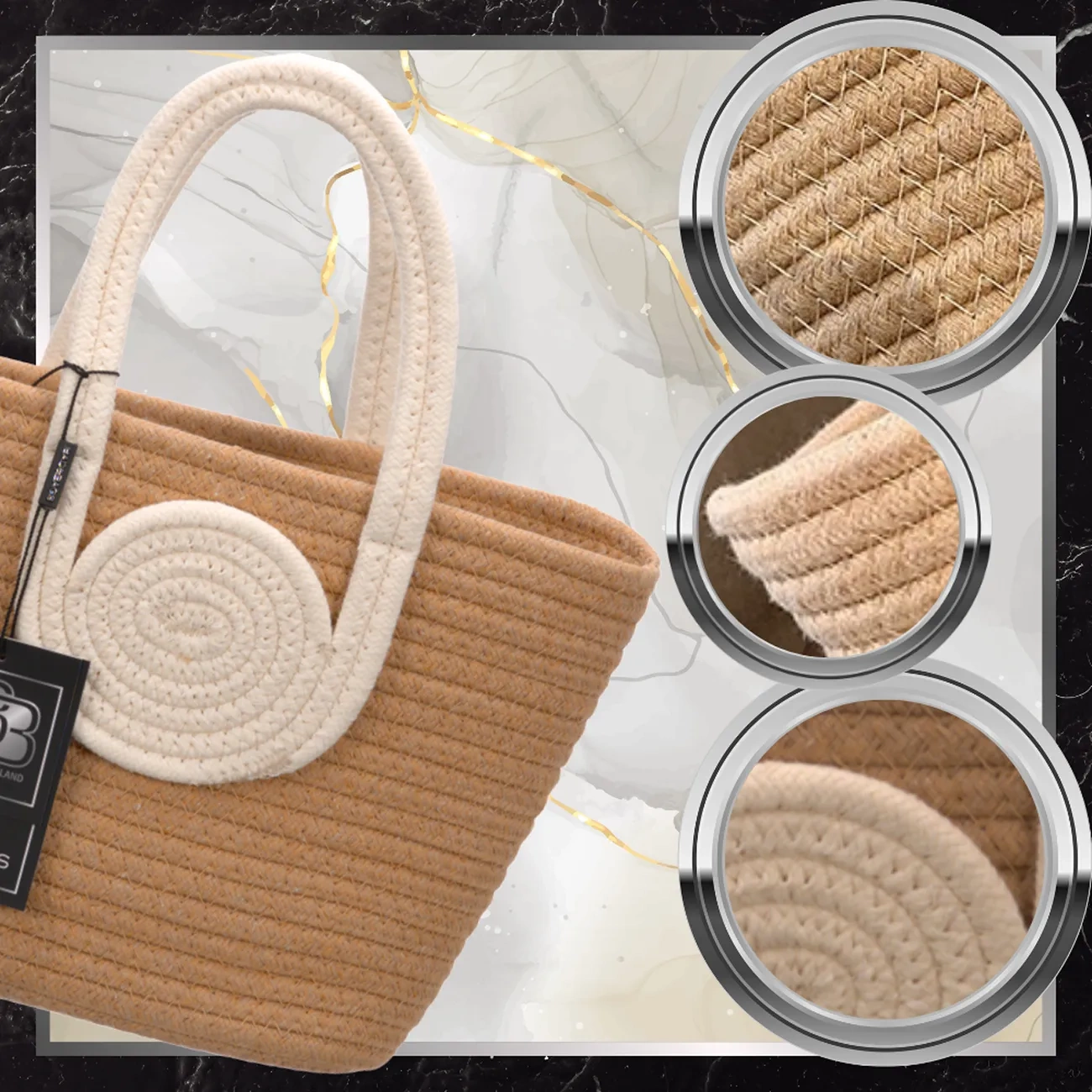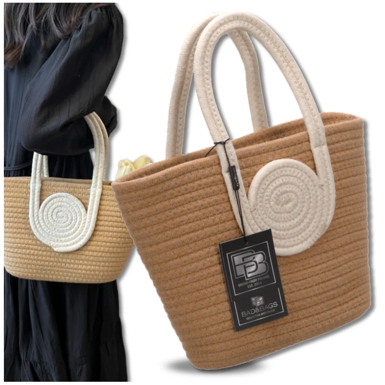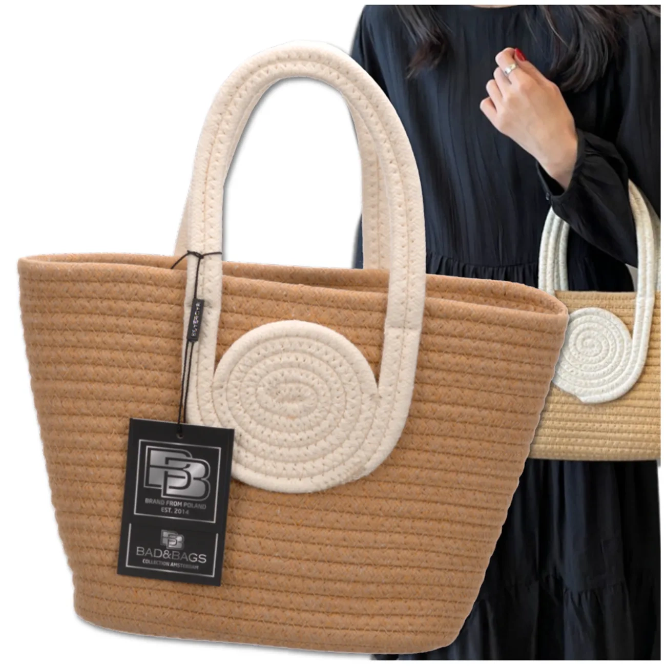 Geanta este realizată din frânghie de bumbac durabilă, estetică, care imită împletitura și îi oferă un aspect unic și rezistență la deteriorare. Nuanta bej combinata cu manere si detalii maro este un clasic care nu se demodeaza niciodata. Dimensiunea mică o face extrem de la îndemână și, în același timp, suficient de încăpătoare pentru a ține cele mai importante lucruri: telefon, portofel, ochelari și produse cosmetice.
