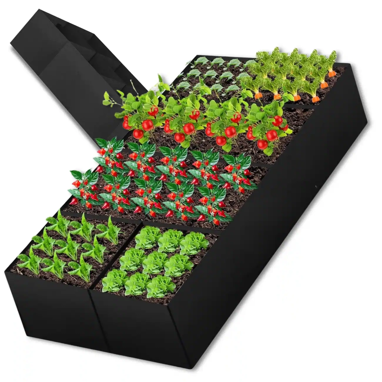 Patul măsoară 180 × 90 cm, ceea ce oferă o suprafață de creștere de aprox. 2 m². Acesta este spațiu suficient pentru a planta confortabil legumele, ierburile sau florile preferate. Patul de legume înălțat are 8 pătrate separate, care permit cultivarea simultană a diferitelor specii de plante într-un singur recipient, fără riscul ca acestea să crească unele peste altele. Această soluție facilitează organizarea spațiului de creștere și promovează o mai bună gestionare a plantelor.
