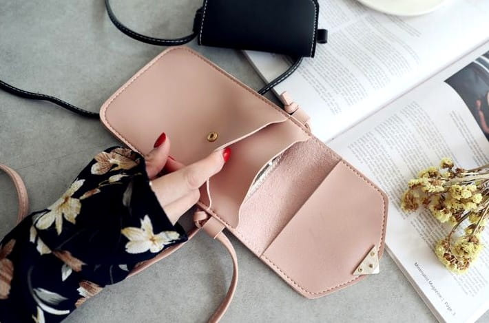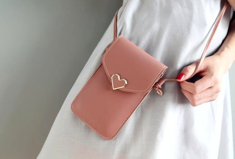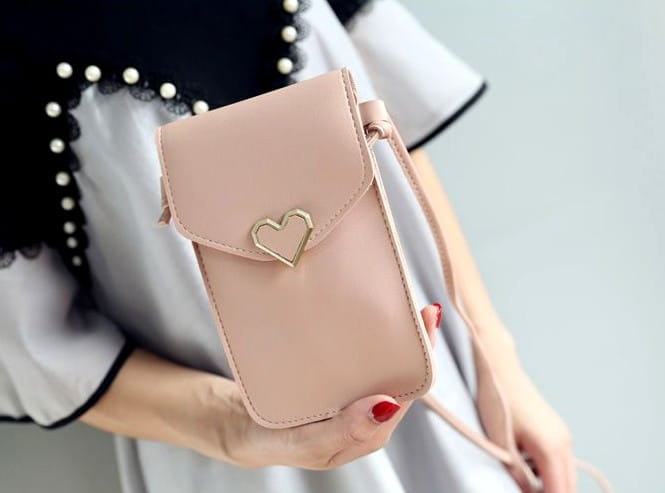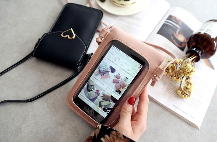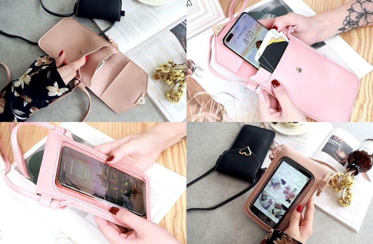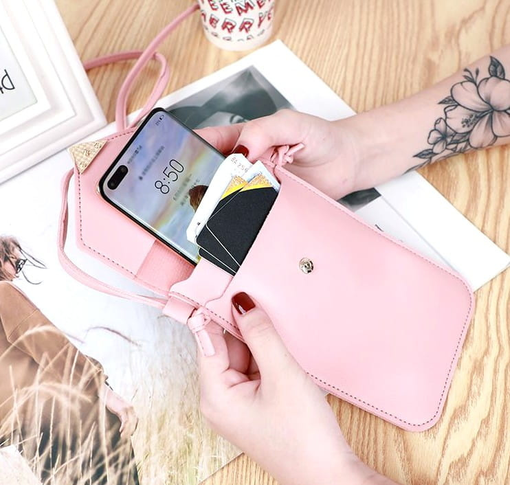 Foarte bine realizată, geanta mică este un portofel și o husă într-unul singur. Husa va găzdui diferite tipuri de smartphone-uri disponibile pe piață. Există un buzunar în interiorul compartimentului genții. O fereastră de folie din spate vă permite să vă folosiți echipamentul fără a-l scoate din pungă. Husa pentru telefon are o curea reglabilă, legată într-un nod, cu o lungime de 135 cm.