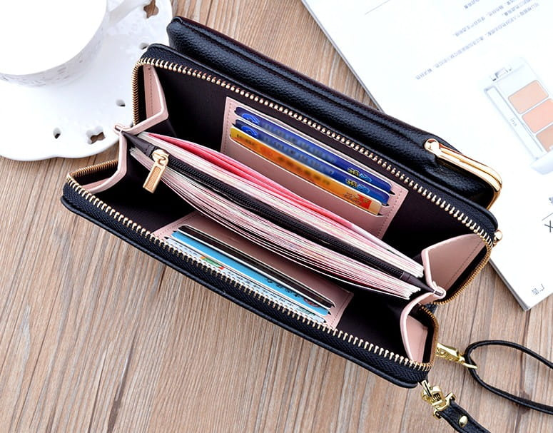 Are două compartimente în interior pentru bancnote, telefon sau alte documente și spațiu pentru 6 cărți de credit