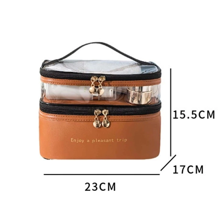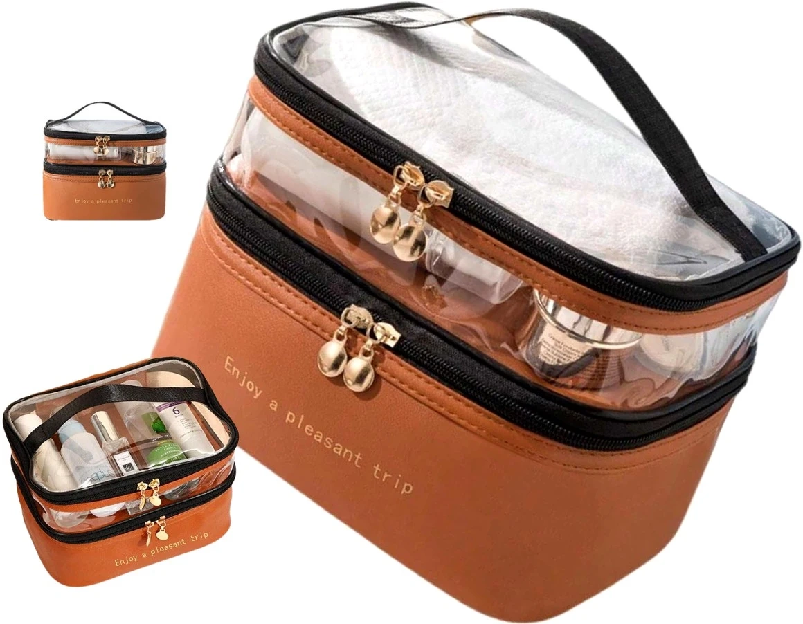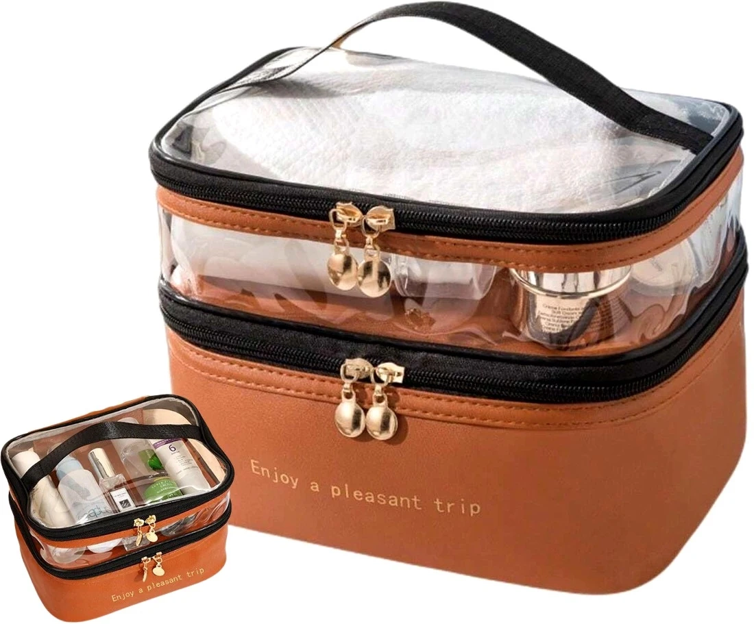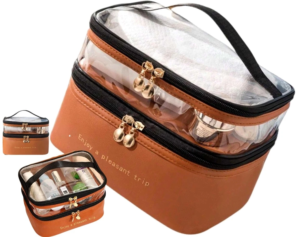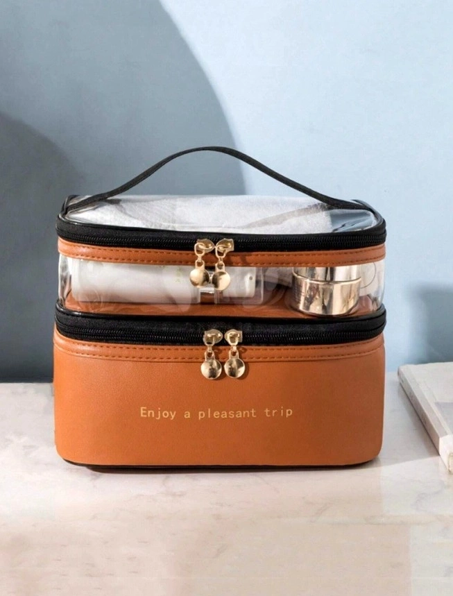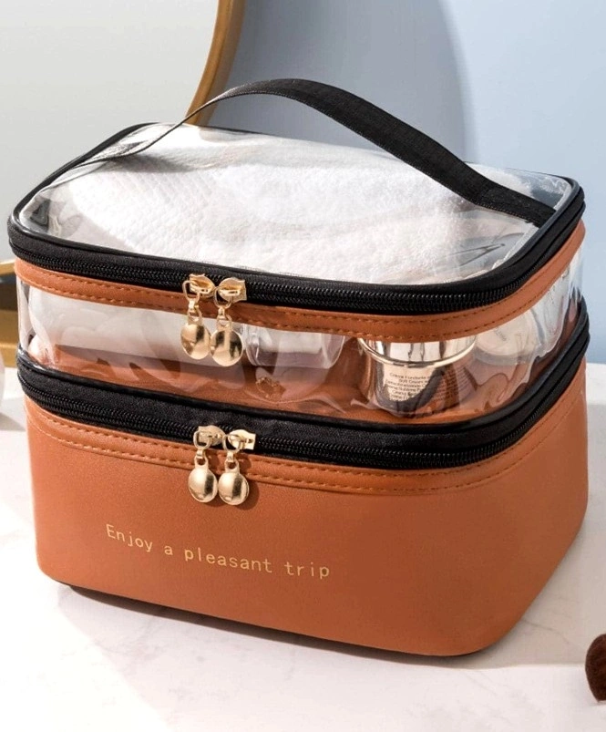 Trusă cosmetică pătrată maro cu două niveluri - o trusă cosmetică frumoasă pentru femei.