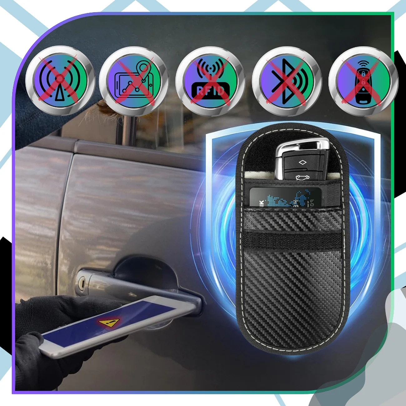 Blochează semnalele: RFID, NFC și semnalul cheii mașinii. protecție antifurt eficientă.