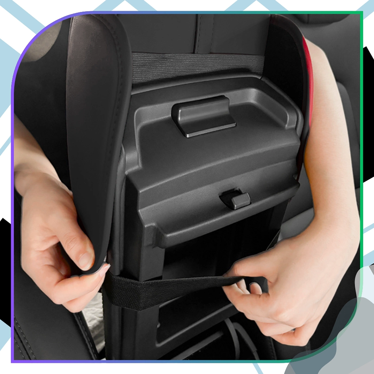Instalarea este rapidă și ușoară - pur și simplu glisați-o pe cotieră și fixați-o cu o curea elastică. Se potrivește aproape tuturor modelelor de mașini, făcându-l o soluție universală.