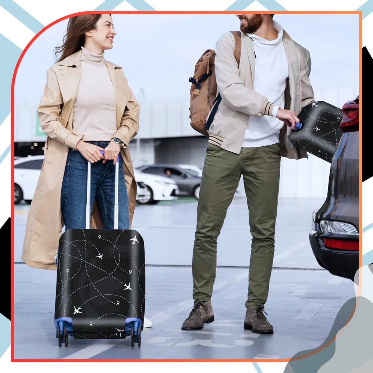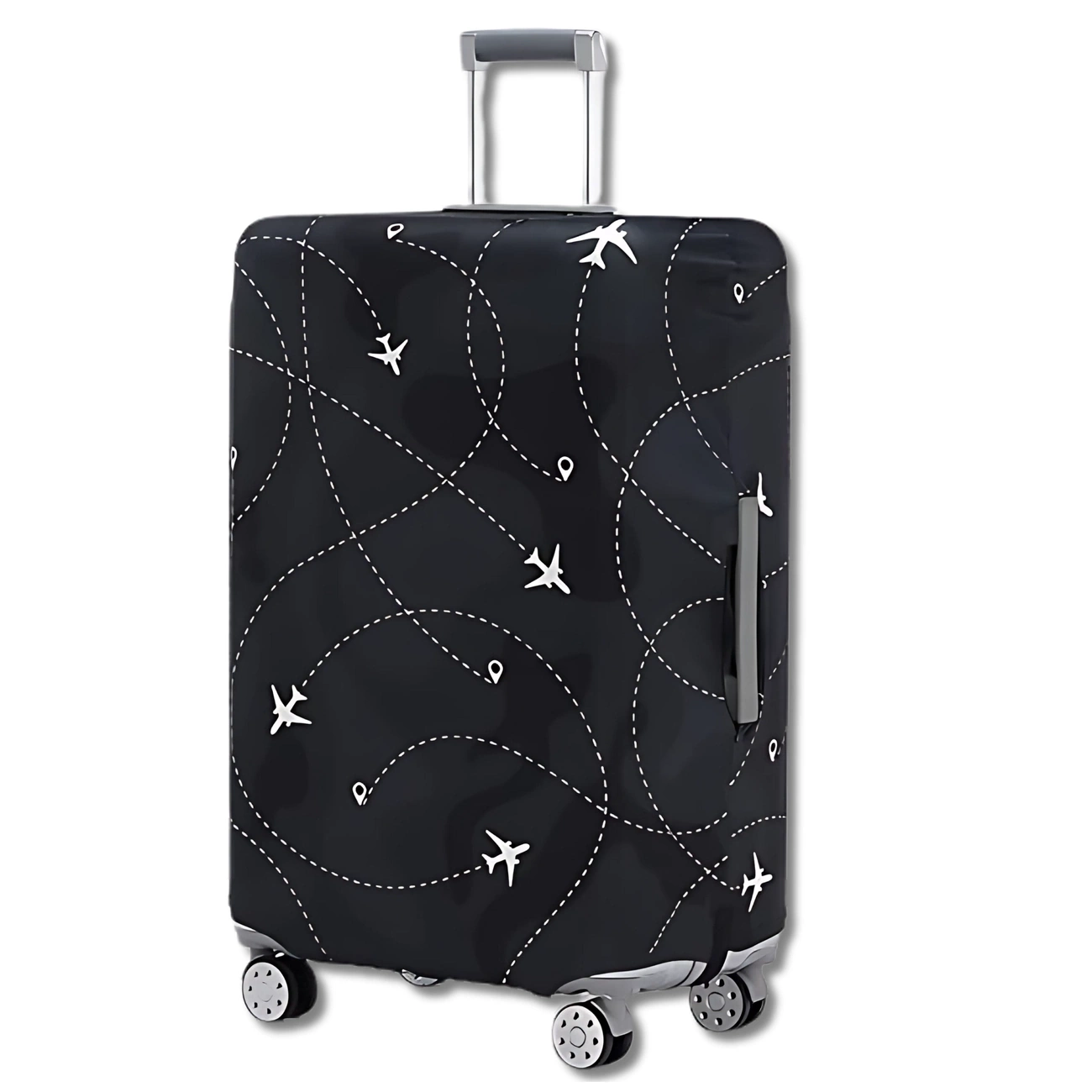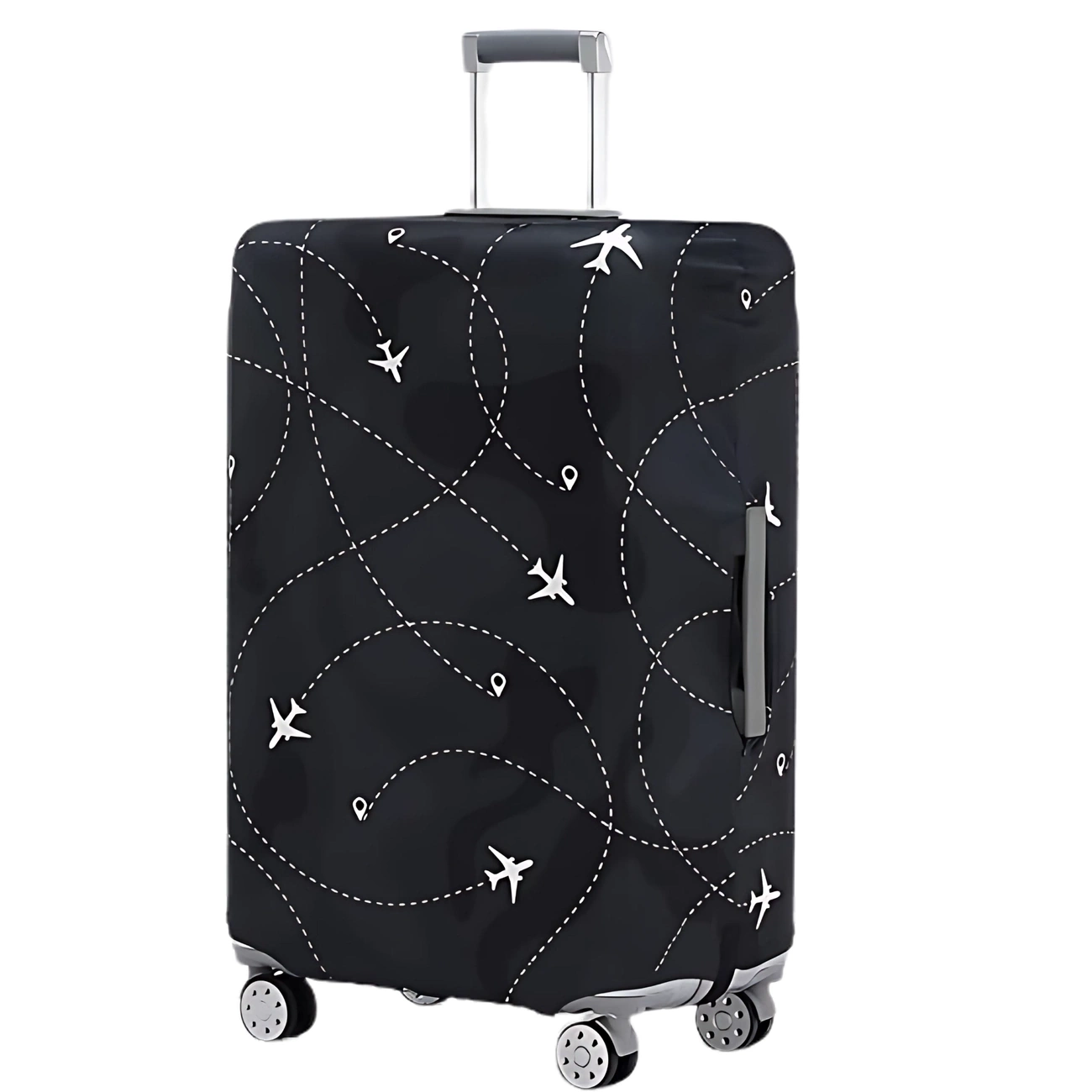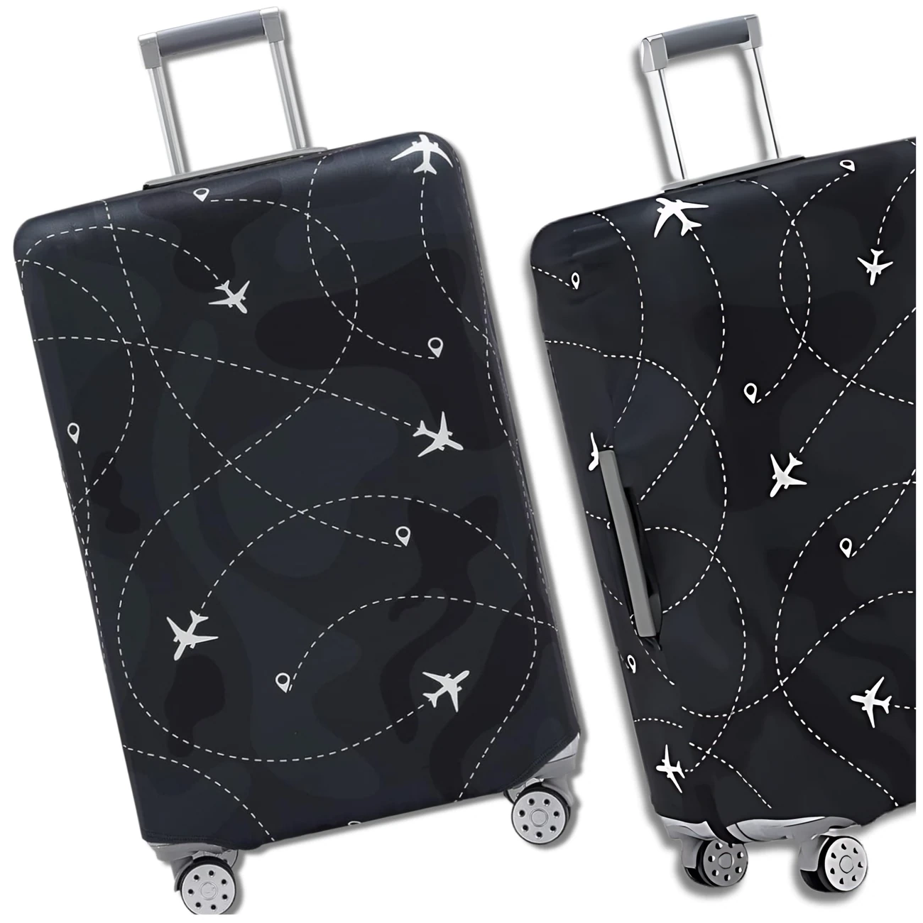 Protejează-ți bagajul în timpul călătoriei și oferă-i un stil modern cu o husă de protecție flexibilă practică și estetică pentru o valiză de călătorie. Modelul minimalist cu un motiv de avioane și rute aeriene pe un fundal negru este alegerea perfectă pentru călătorii frecventi care apreciază eleganța clasică combinată cu funcționalitatea.