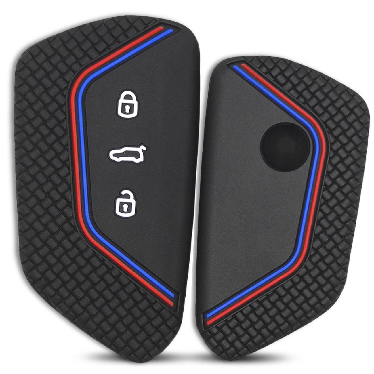 Culoare: negru-albastru-roșu. fiecare șofer care dorește să-și protejeze telecomanda de daunele cotidiene. Acest model a fost creat pentru cheile Volkswagen Golf 8 și Volkswagen Passat, garantând o potrivire perfectă și o funcționalitate completă a butoanelor.