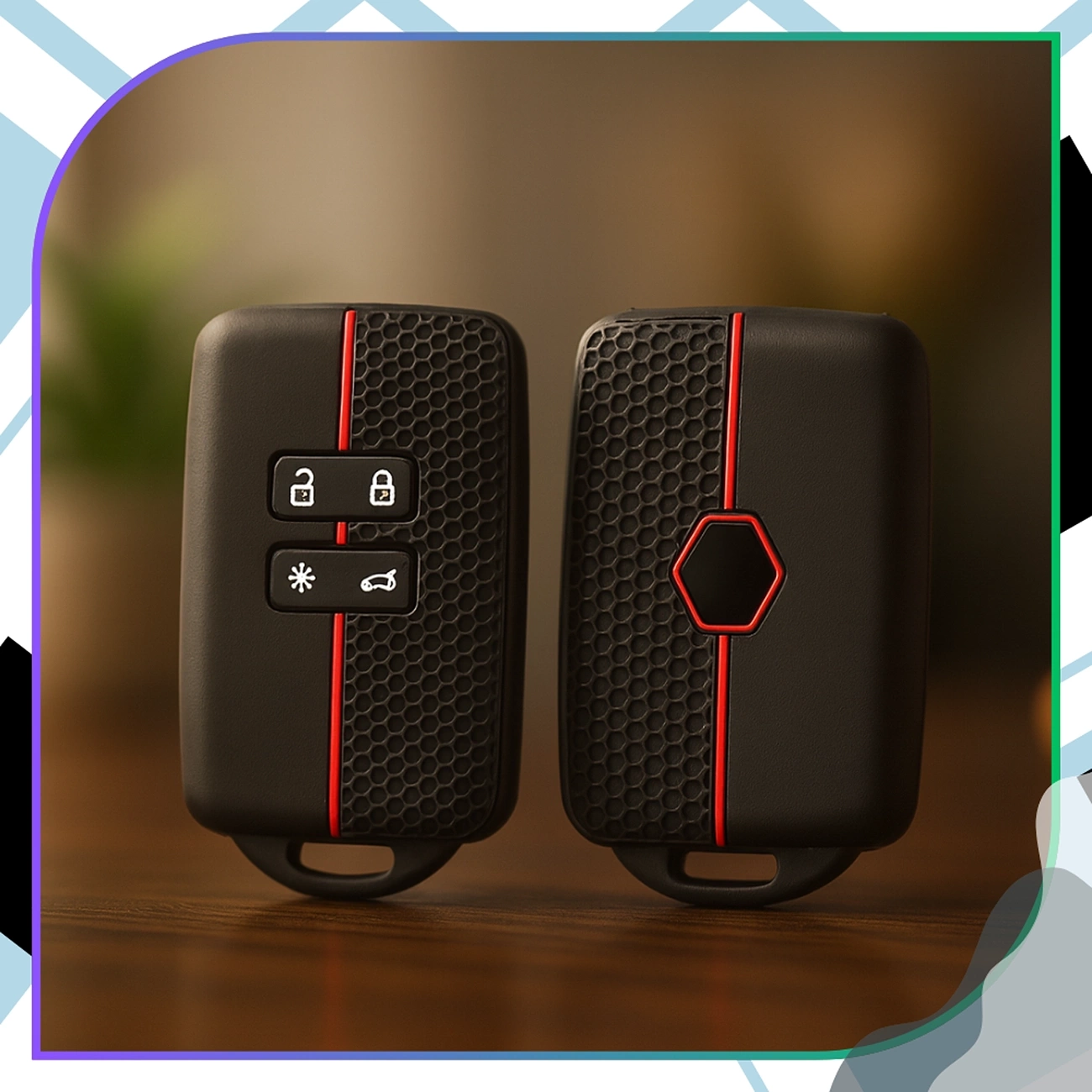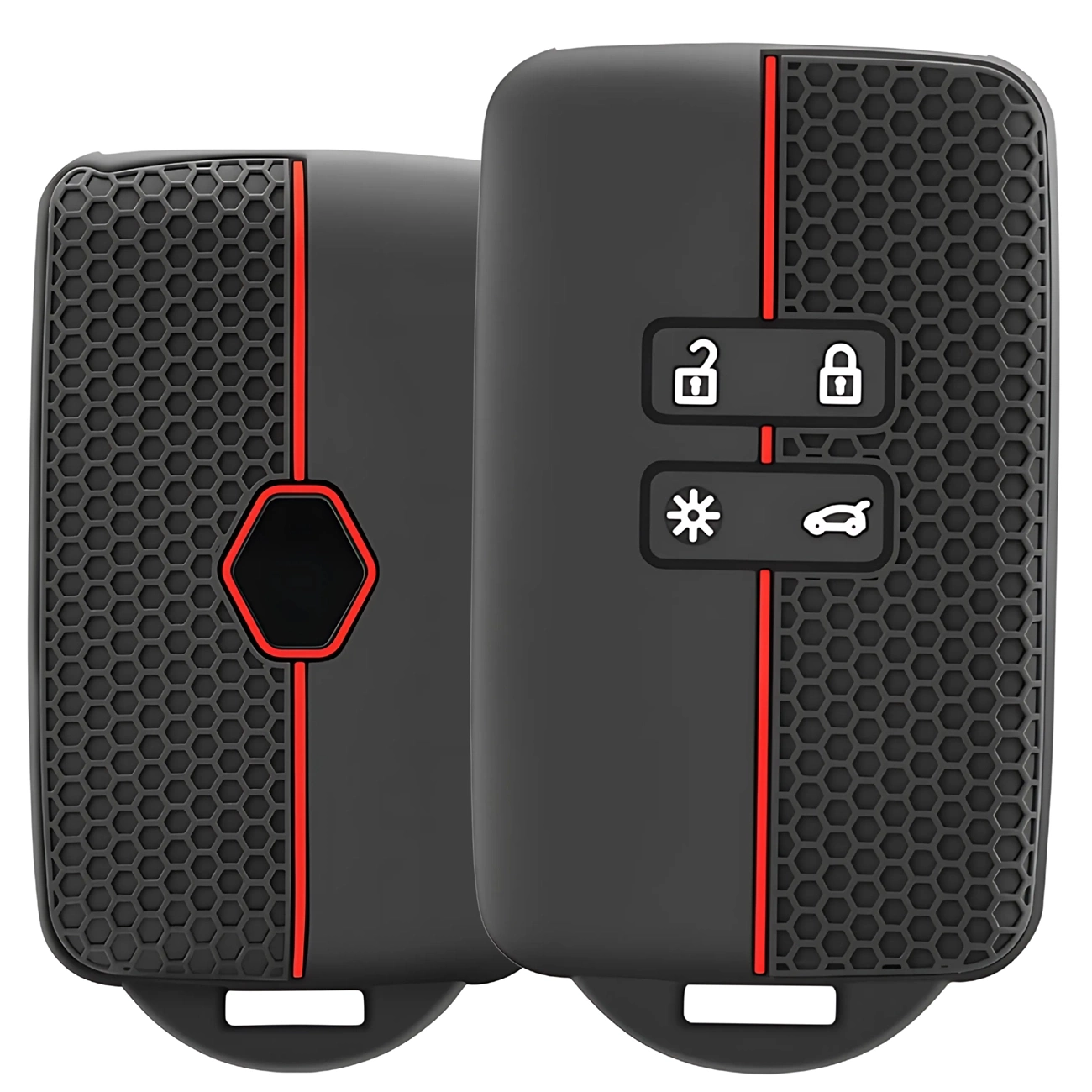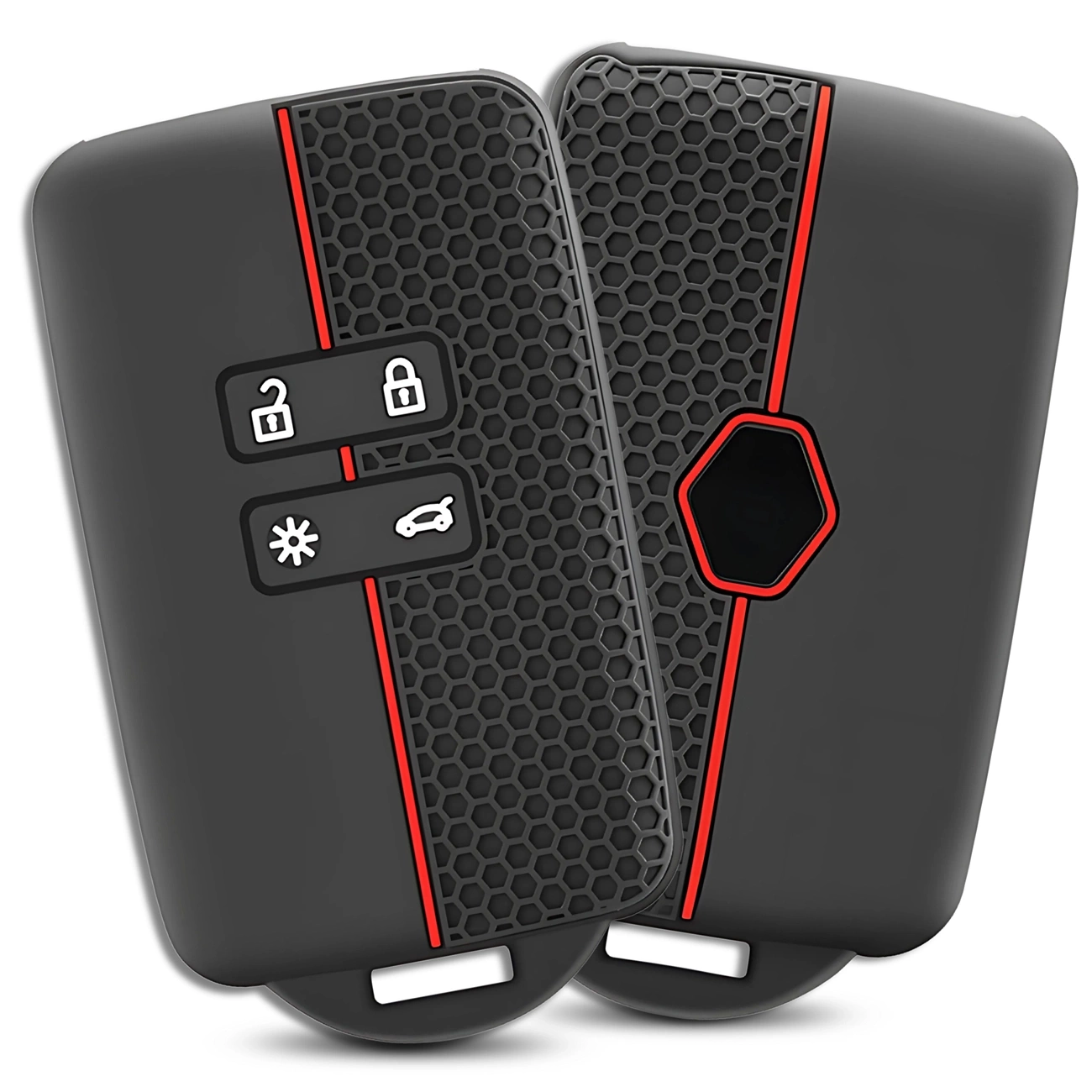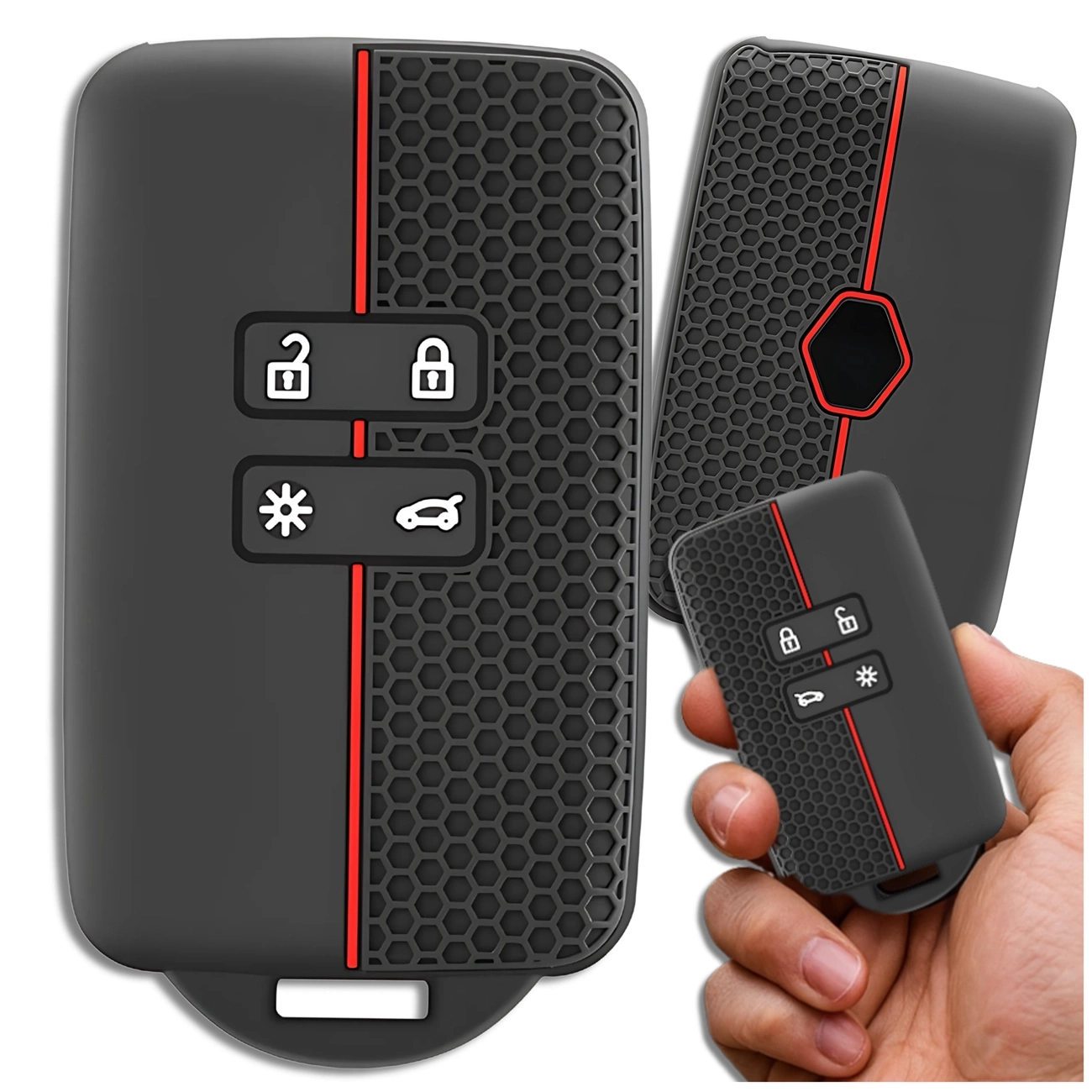 Designul modern al carcasei se distinge prin stilul său sportiv și elegant. Culoarea clasică neagră combinată cu un accent roșu dinamic oferă cheii un aspect unic. Suprafața texturată cu un model de tip fagure mărește confortul de utilizare și îmbunătățește aderența, prevenind alunecarea telecomenzii din mână.