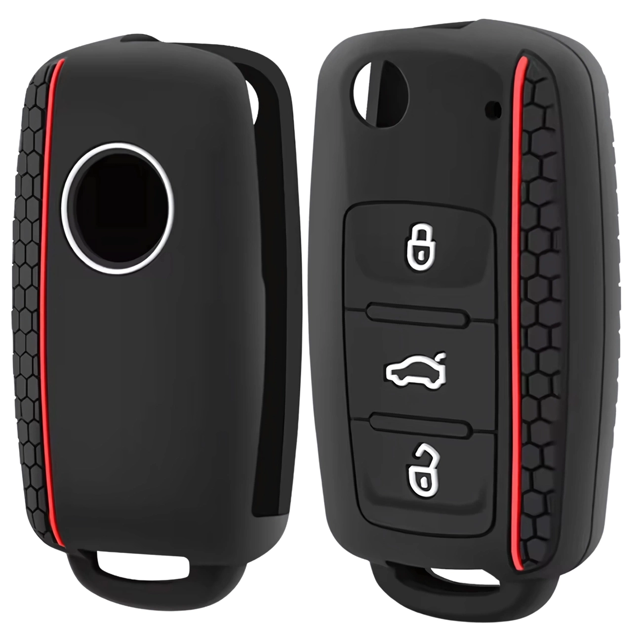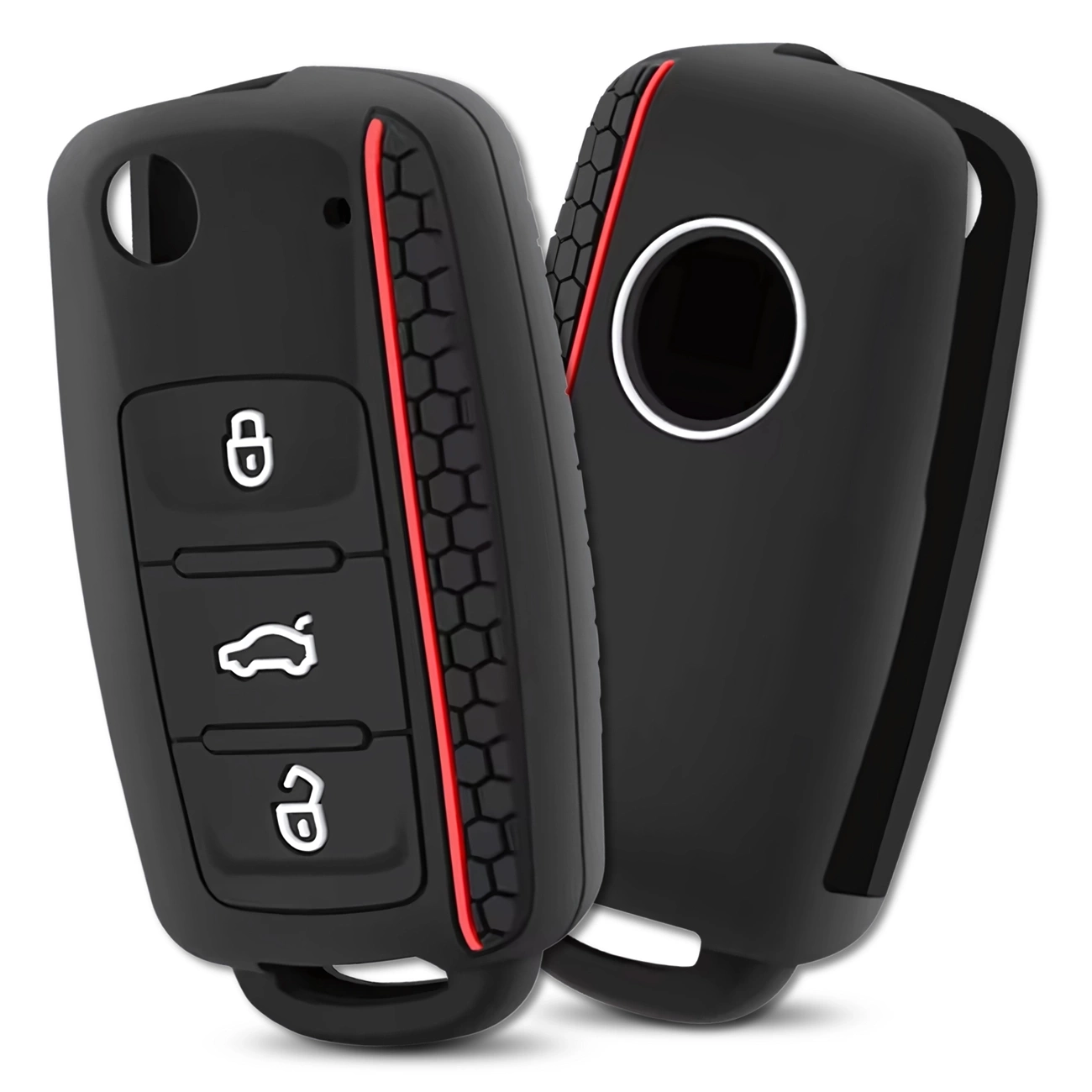 Designul unic al carcasei în negru și roșu oferă cheii tale o notă sportivă. Laturile texturate cu un model de tip fagure îmbunătățesc aderența și sporesc confortul de utilizare, împiedicând telecomanda să vă alunece din mână. Este combinația perfectă de funcționalitate și stil.