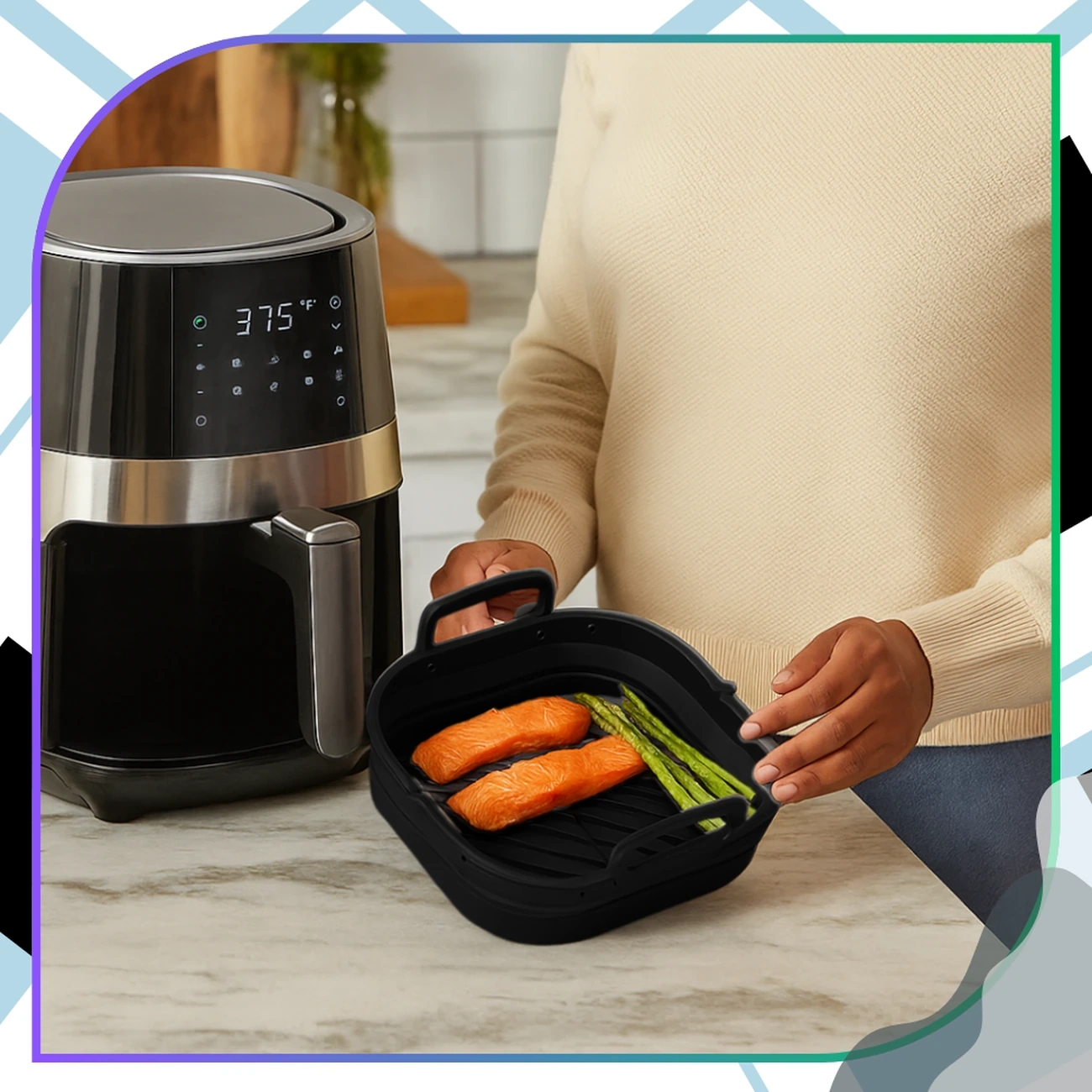 Fabricată din silicon alimentar de înaltă calitate, inserția este complet sigură pentru alimente, rezistentă la căldură (până la 230°C) și flexibilă. Nu absoarbe mirosurile sau grăsimea, astfel încât fiecare fel de mâncare își păstrează aroma și aroma naturală. **Insertul din silicon pentru friteuza cu aer** măsoară 22 x 23,1 x 5,9 cm, fiind potrivit pentru majoritatea modelelor populare de friteuze cu aer.
