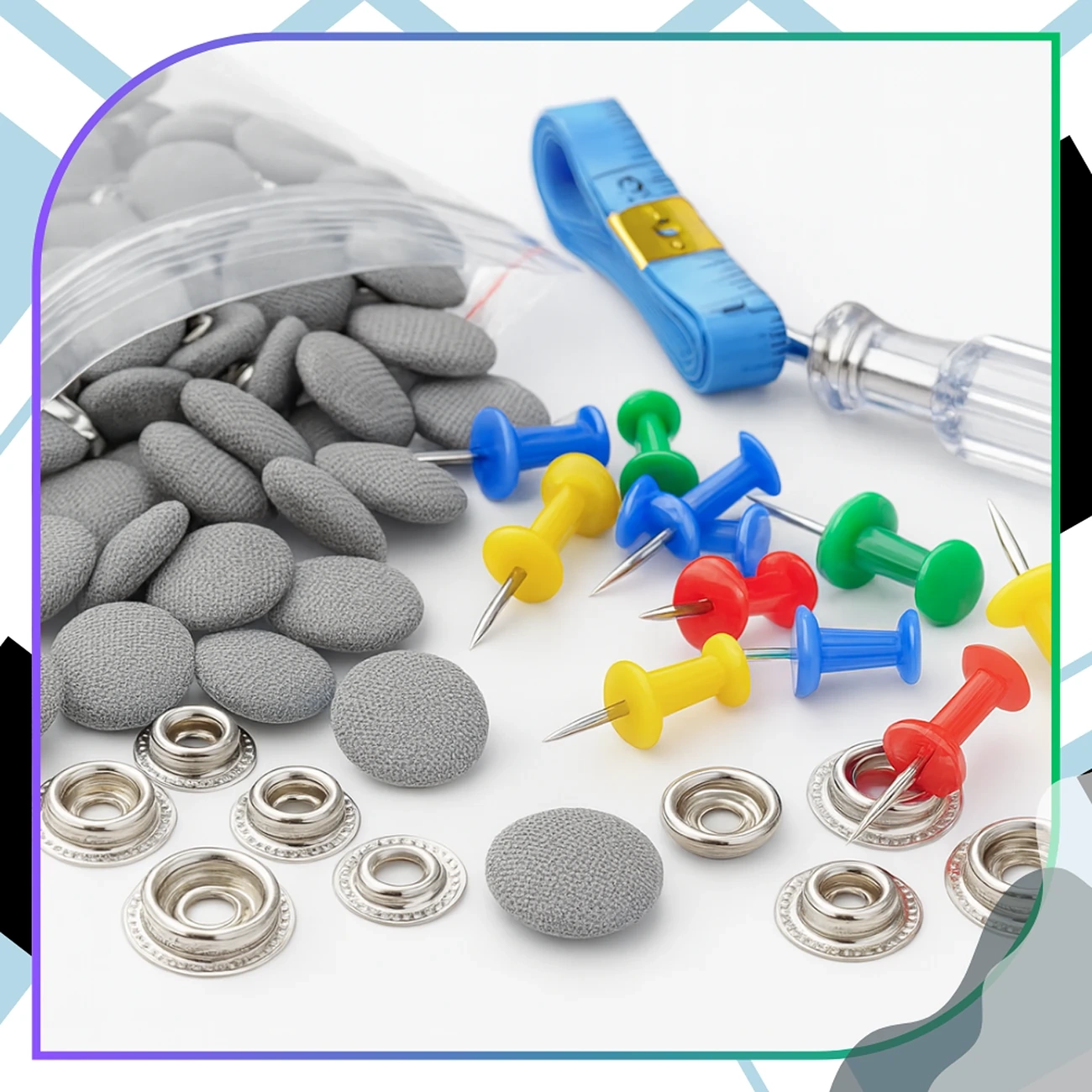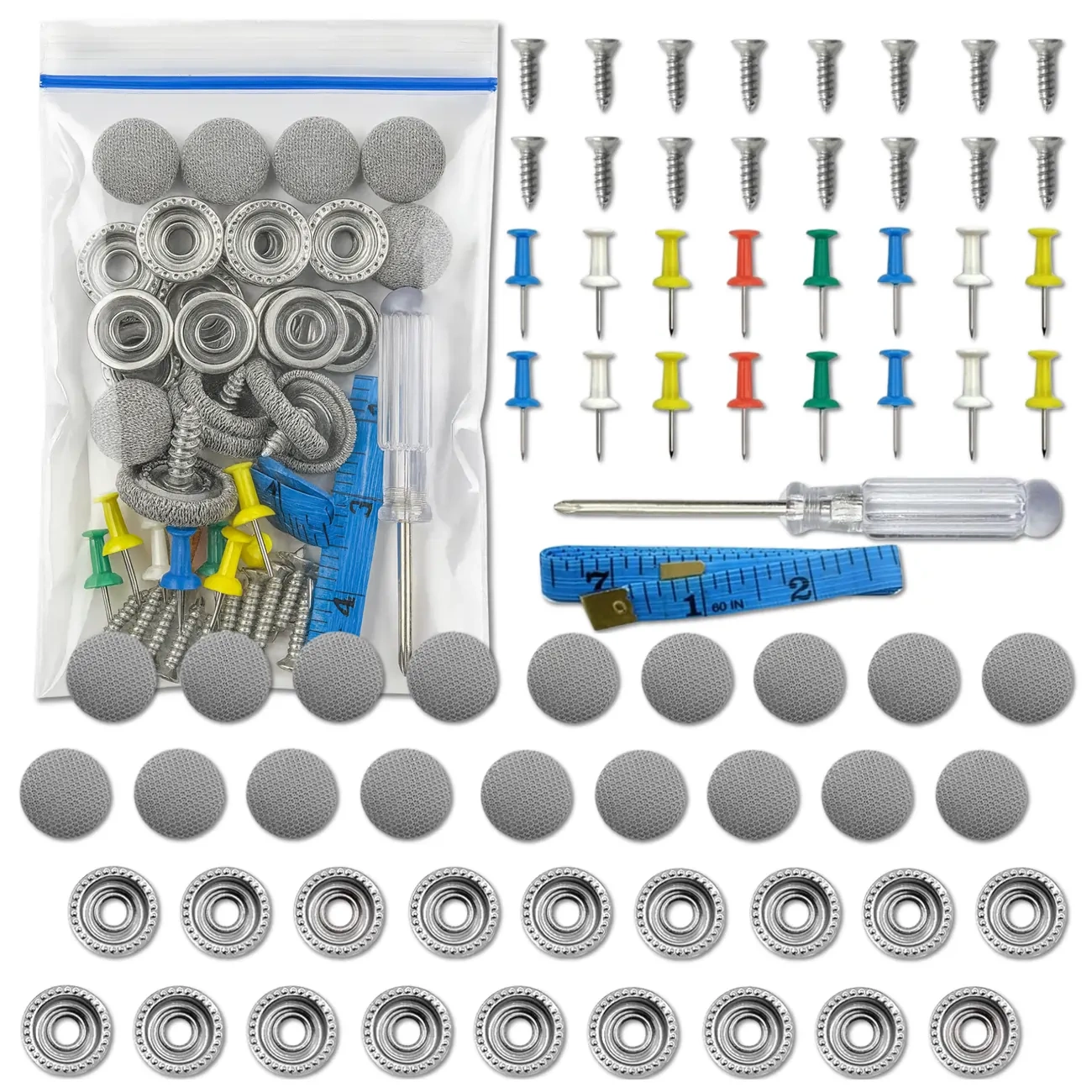 Setul include: 60 de nituri de reparații gri acoperite cu țesătură plasă, 60 de chinuri colorate, o șurubelniță și o bandă de măsurare pentru a facilita plasarea precisă a elementelor de fixare. Această soluție completă permite o reparație solidă imediat după primire.