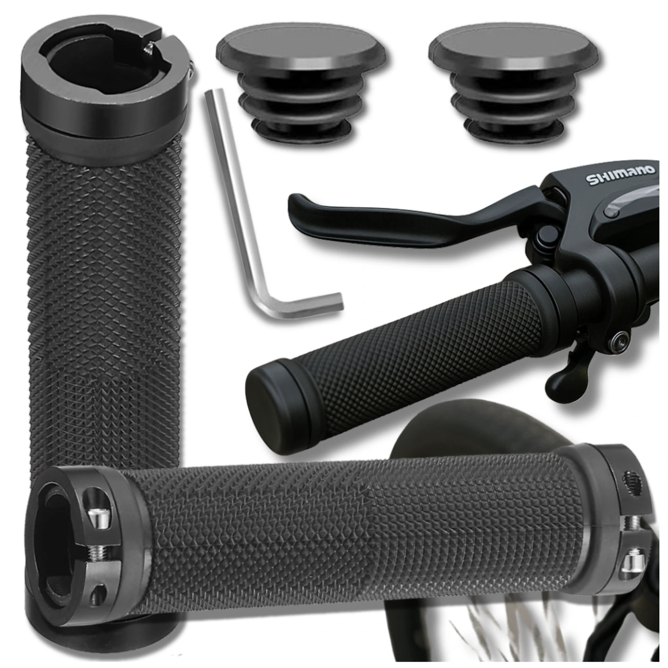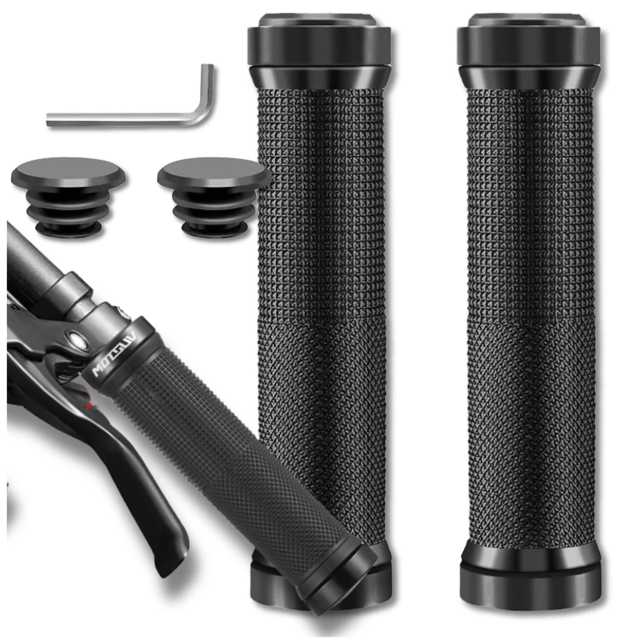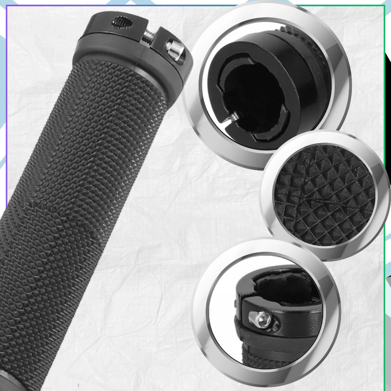 Fabricate din cauciuc de înaltă calitate, mânerele sunt durabile, flexibile și au proprietăți excelente de amortizare a vibrațiilor. **Textura suprafeței antiderapante** garantează o priză stabilă chiar și în ploaie sau în timpul mersului intens. **Inelele de blocare din aliaj de aluminiu** împiedică rotirea mânerelor pe ghidon, ceea ce crește siguranța și controlul.