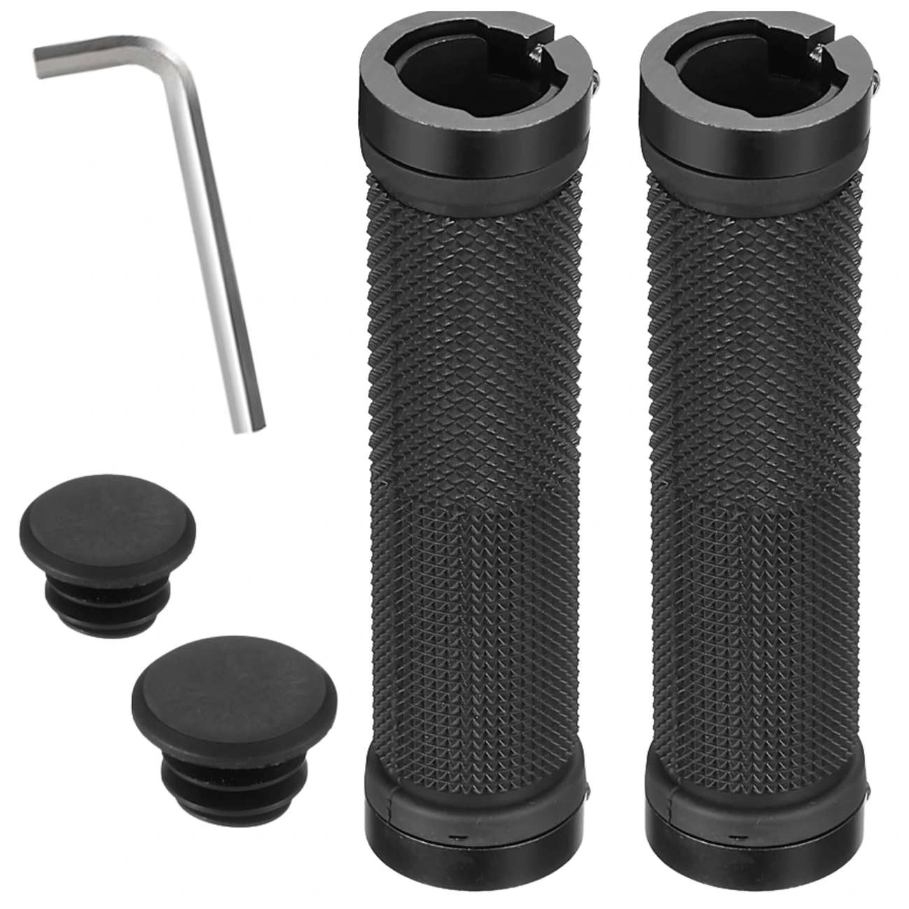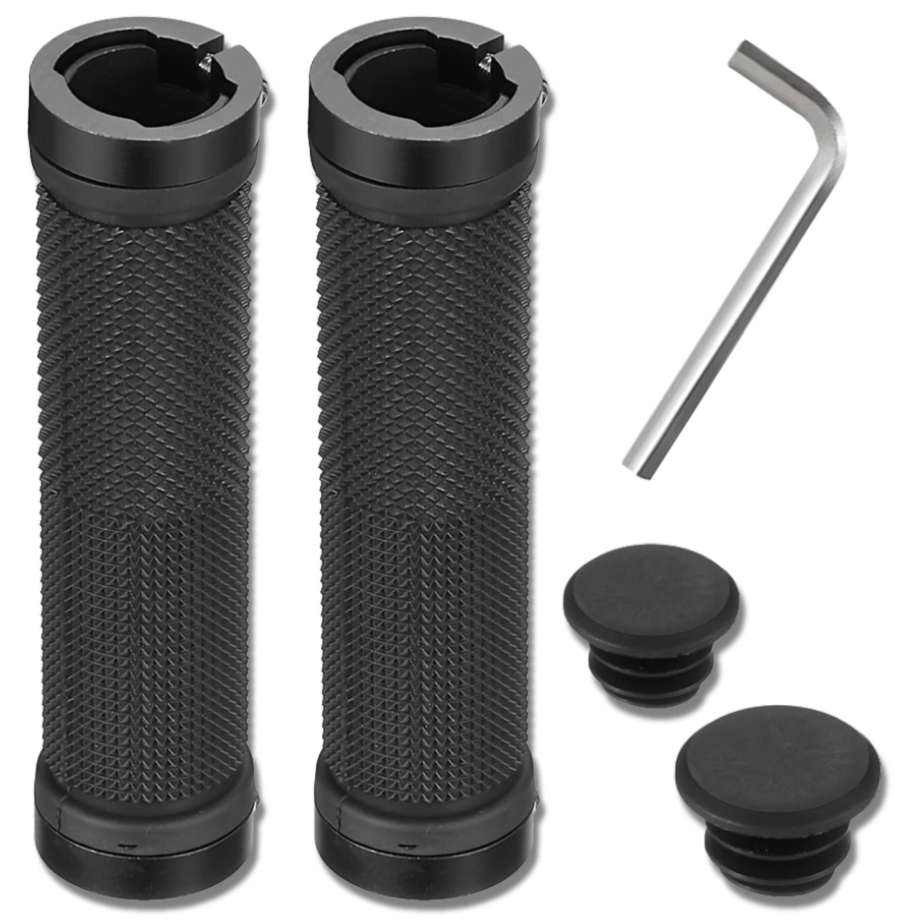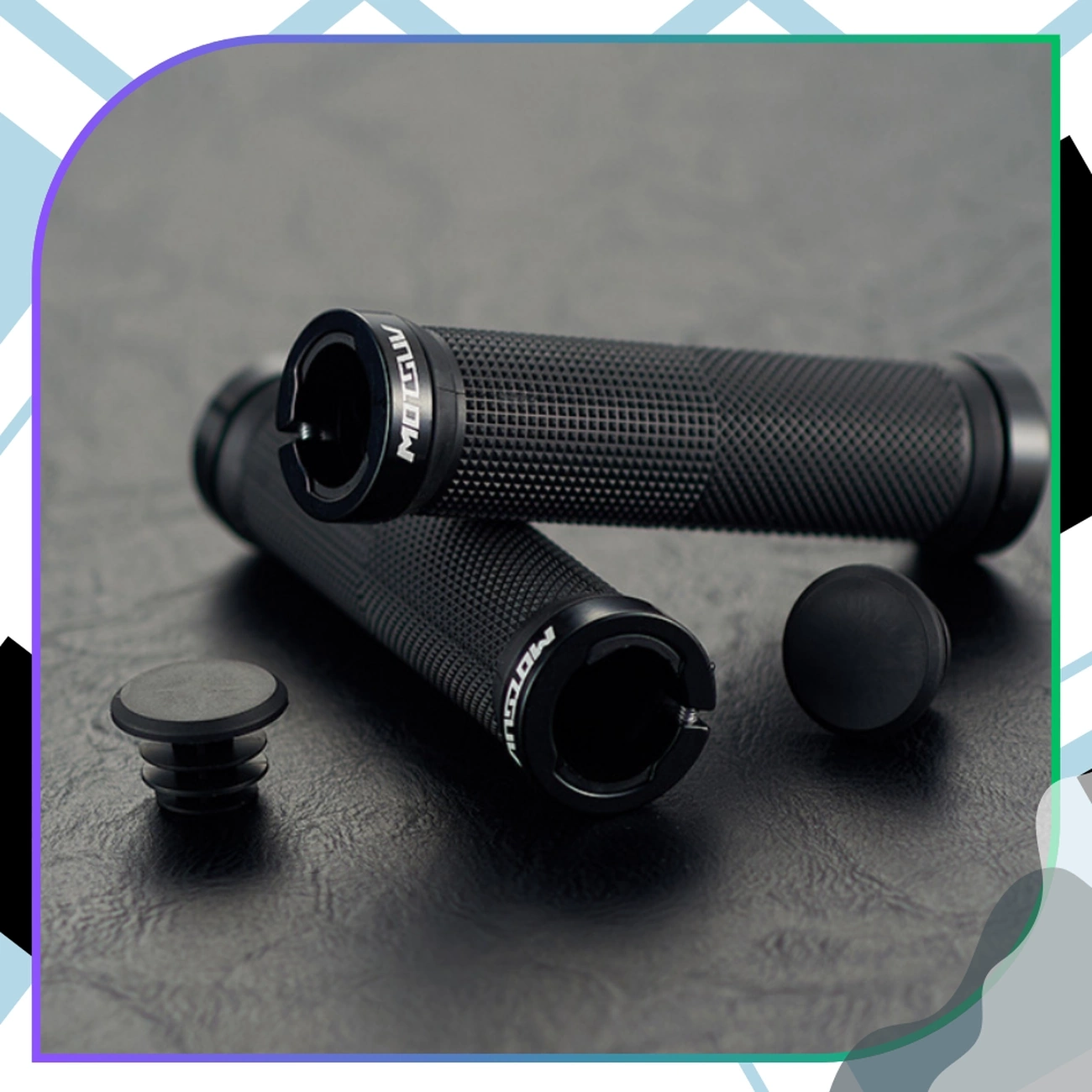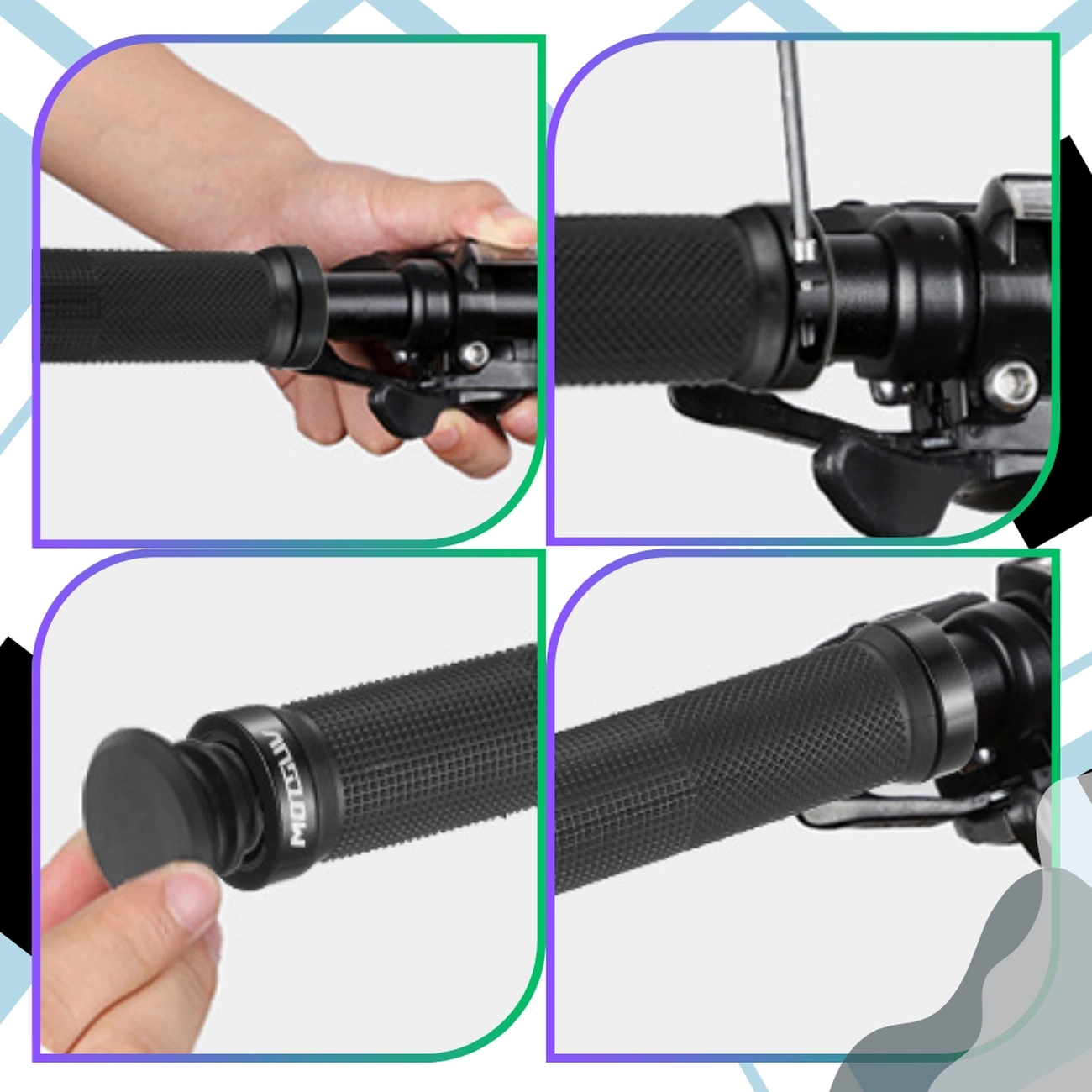 Fabricate din cauciuc de înaltă calitate, mânerele sunt durabile, flexibile și au proprietăți excelente de amortizare a vibrațiilor. **Textura suprafeței antiderapante** garantează o priză stabilă chiar și în ploaie sau în timpul mersului intens. **Inelele de blocare din aliaj de aluminiu** împiedică rotirea mânerelor pe ghidon, ceea ce crește siguranța și controlul.
