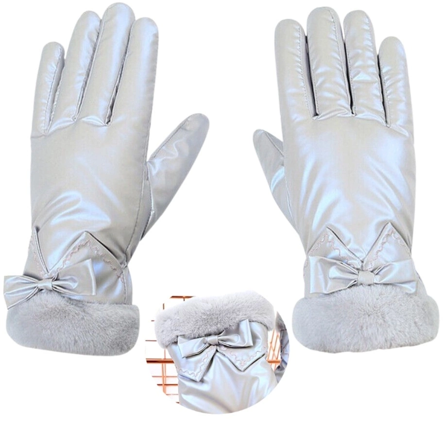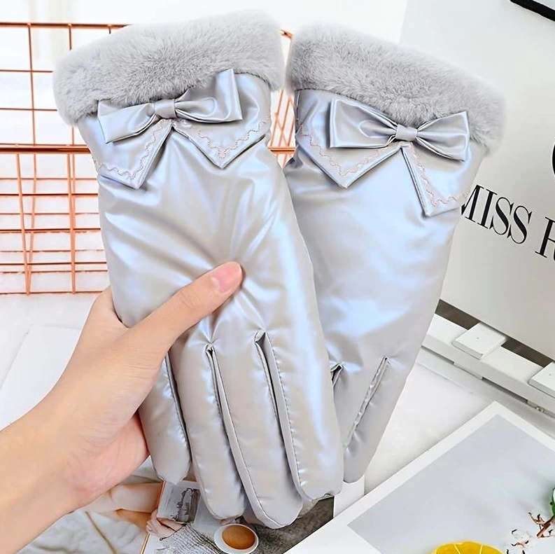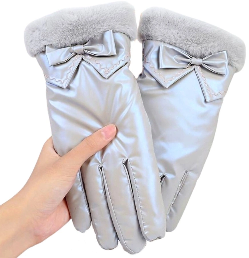 Mănușile izbitoare sunt disponibile într-o culoare gri lucios. Arcurile mici, blana pufoasă și cusăturile în zigzag adaugă farmec.