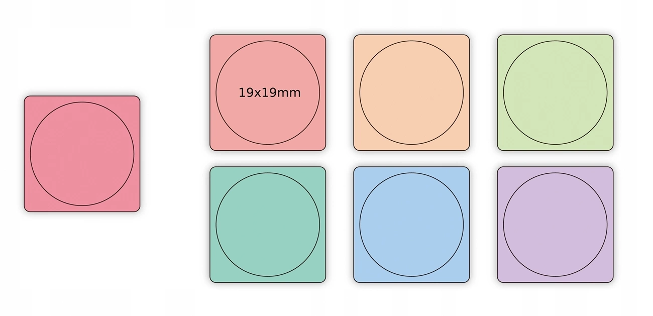 Aici vindem 1 rolă de etichete termice 19x19mm, 7 culori, 290 bucăți autocolante pentru imprimante Niimbot D101