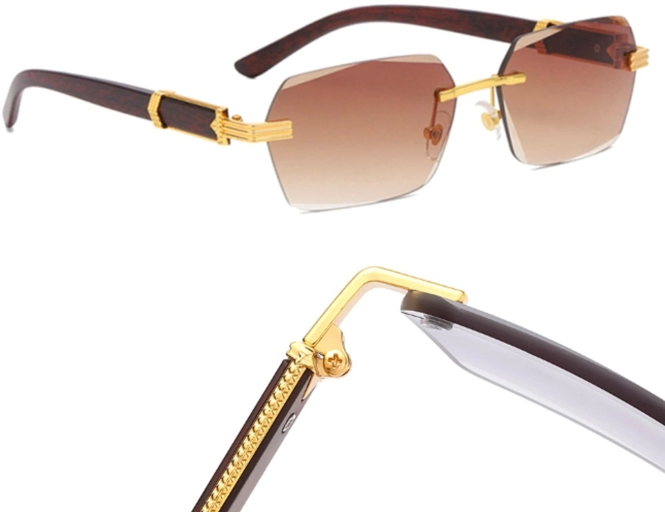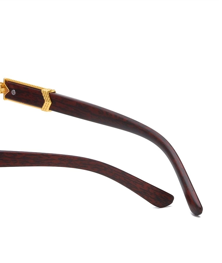Acești ochelari sunt extrem de atrăgători din punct de vedere vizual. Lentilele nu au rame, iar tâmplele sunt realizate din material sintetic care seamănă cu lemnul natural. Întregul design este împodobit cu elemente metalice delicate de culoare aurie.