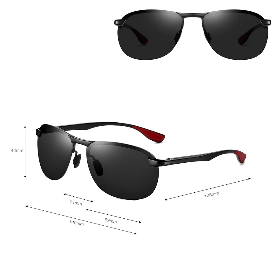 Dimensiunile lor sunt: lățimea ramei 138 mm, lungimea tâmplei 140 mm, lățimea ramei cu lentile 59 mm, înălțimea ramei cu lentile 44 mm și lungimea punții 21 mm. Ochelarii de soare din metal polarizat certificați pentru bărbați sunt trimiși clientului cu o husă rigidă gratuită.