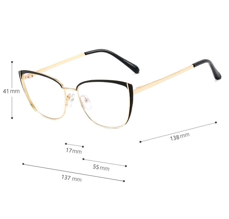 Ochelarii eleganți cat eye cu antireflector au următoarele dimensiuni: lungime tâmplă 138 mm, lățime ramă 137 mm, înălțime ramă cu lentile 41 mm, lățime ramă cu lentile 55 mm și lungime punte 17 mm.