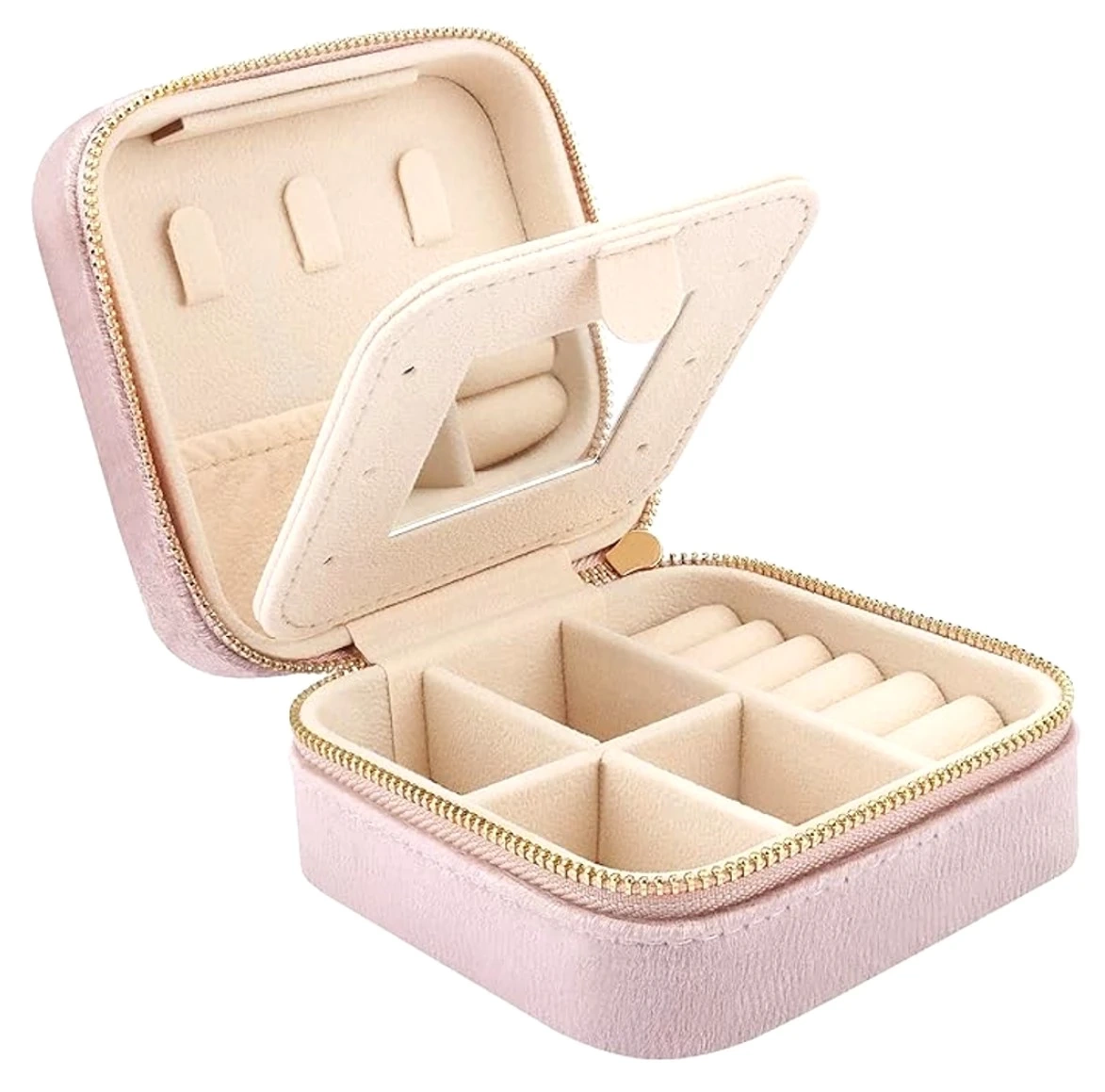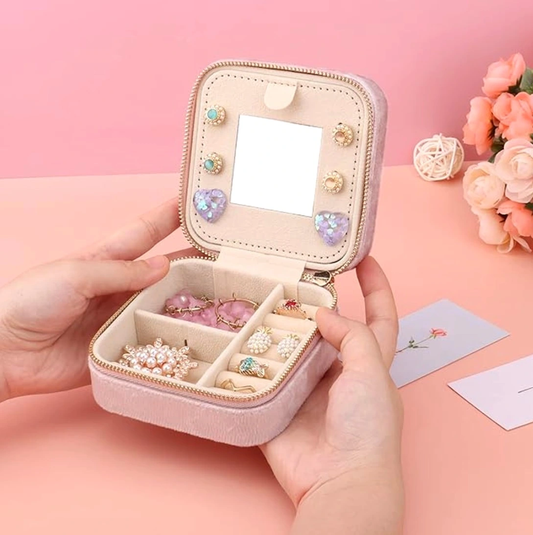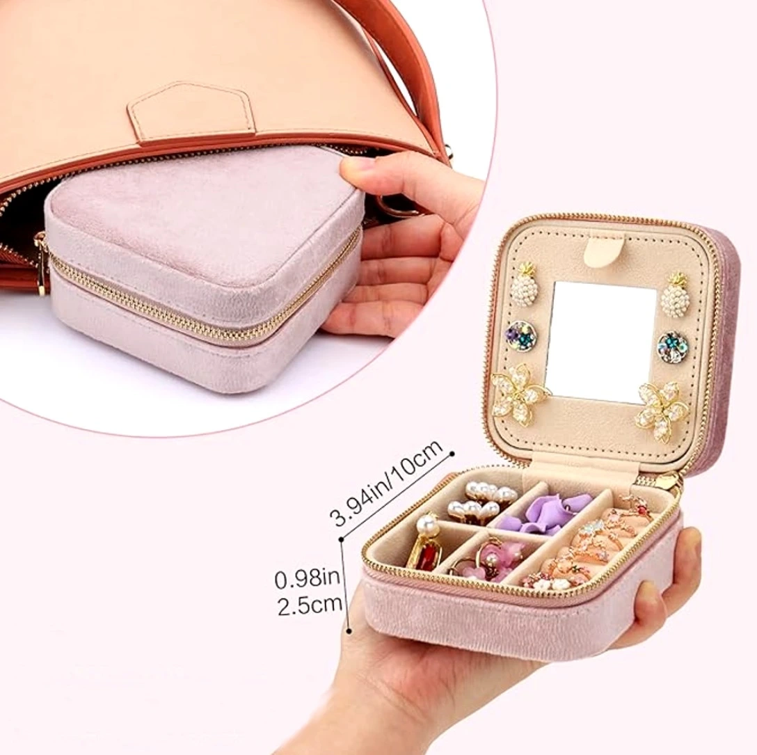 Organizatorul de casetă cu oglindă pentru bijuterii se închidecu un fermoar auriu cu o mică etichetă circulară aurie. Cutia este extrem de practică, motiv pentru care clienților noștri le place să o folosească atât acasă, cât și în călătorii de afaceri.