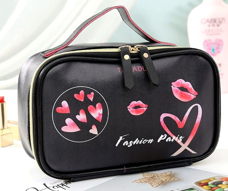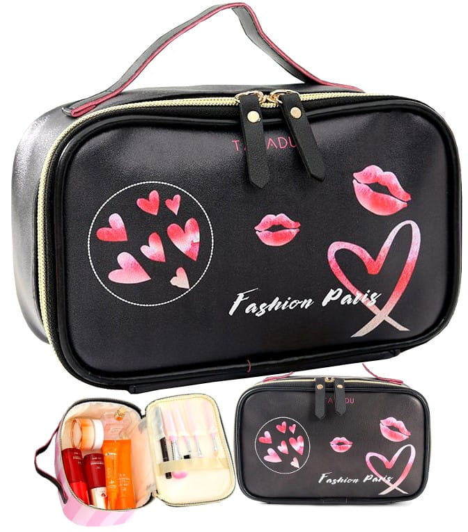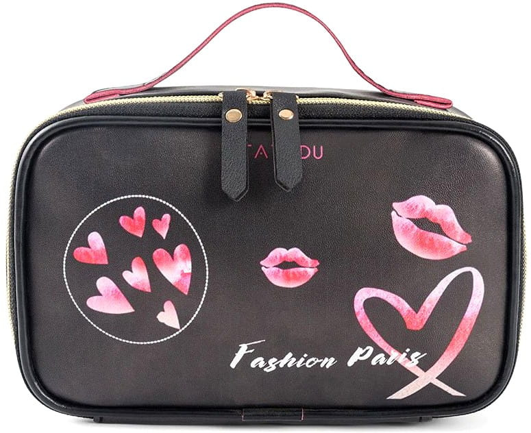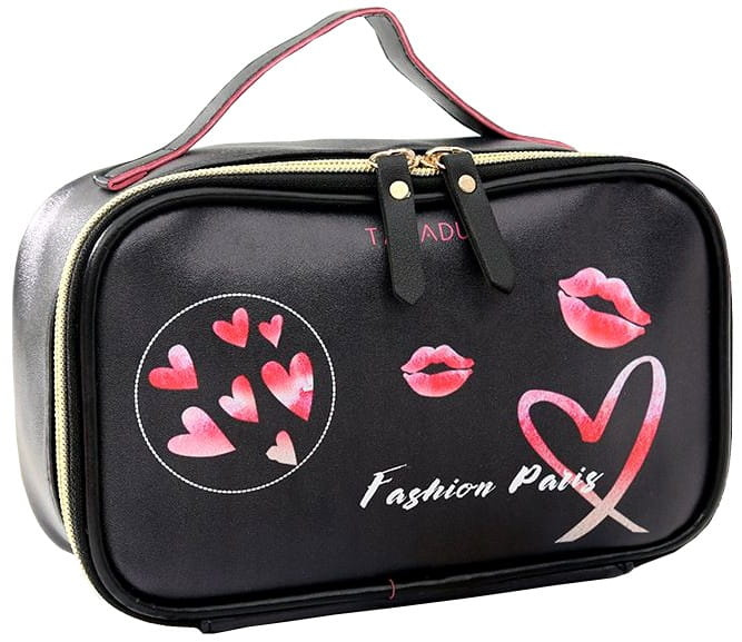 Geanta cosmetică impermeabilă de mărime medie recomandată de magazinul nostru online va găzdui cu ușurință pensulele folosite pentru machiaj. Acest produs are un mâner funcțional, plasat în partea superioară, care îl face ușor de transportat în mâini. Fermoarele duble din metal de culoare aurie nu vor rugini atunci când sunt expuse la umezeală. Această geantă cosmetică impermeabilă este decorată cu un imprimeu interesant sub formă de inimi, buze și cuvântul Fashion Paris.