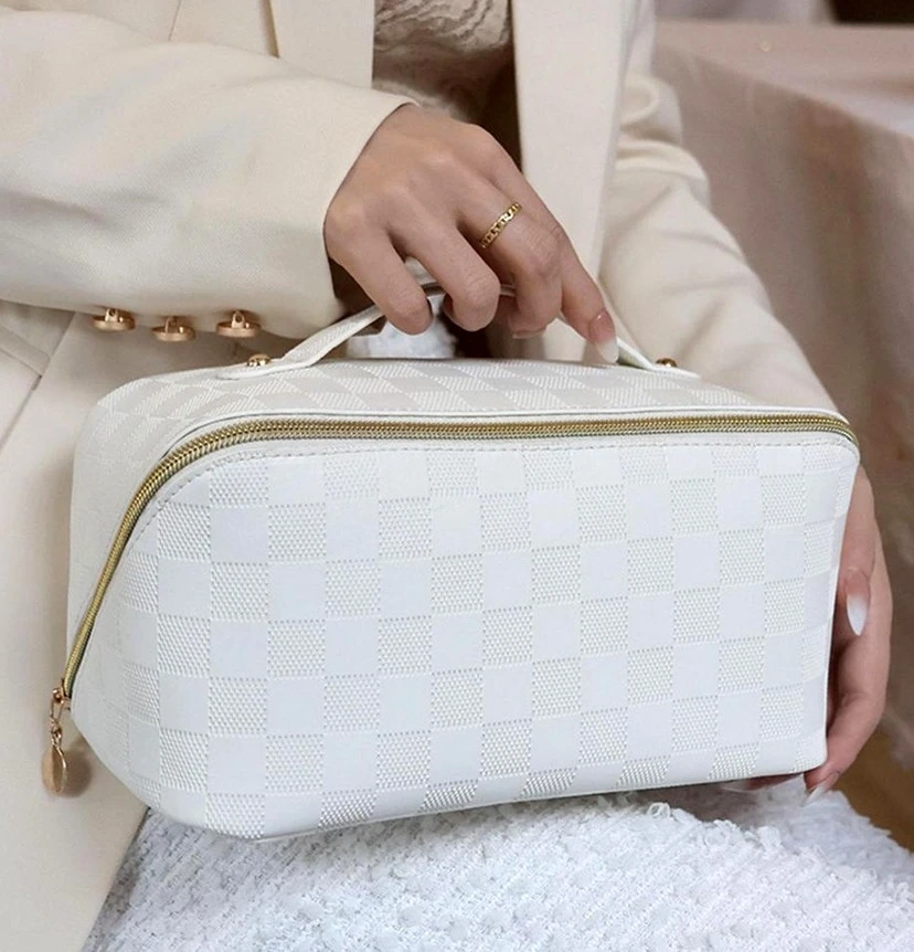✅ Geantă elegantă pentru cosmetice realizată din piele ecologică de culoare crem.