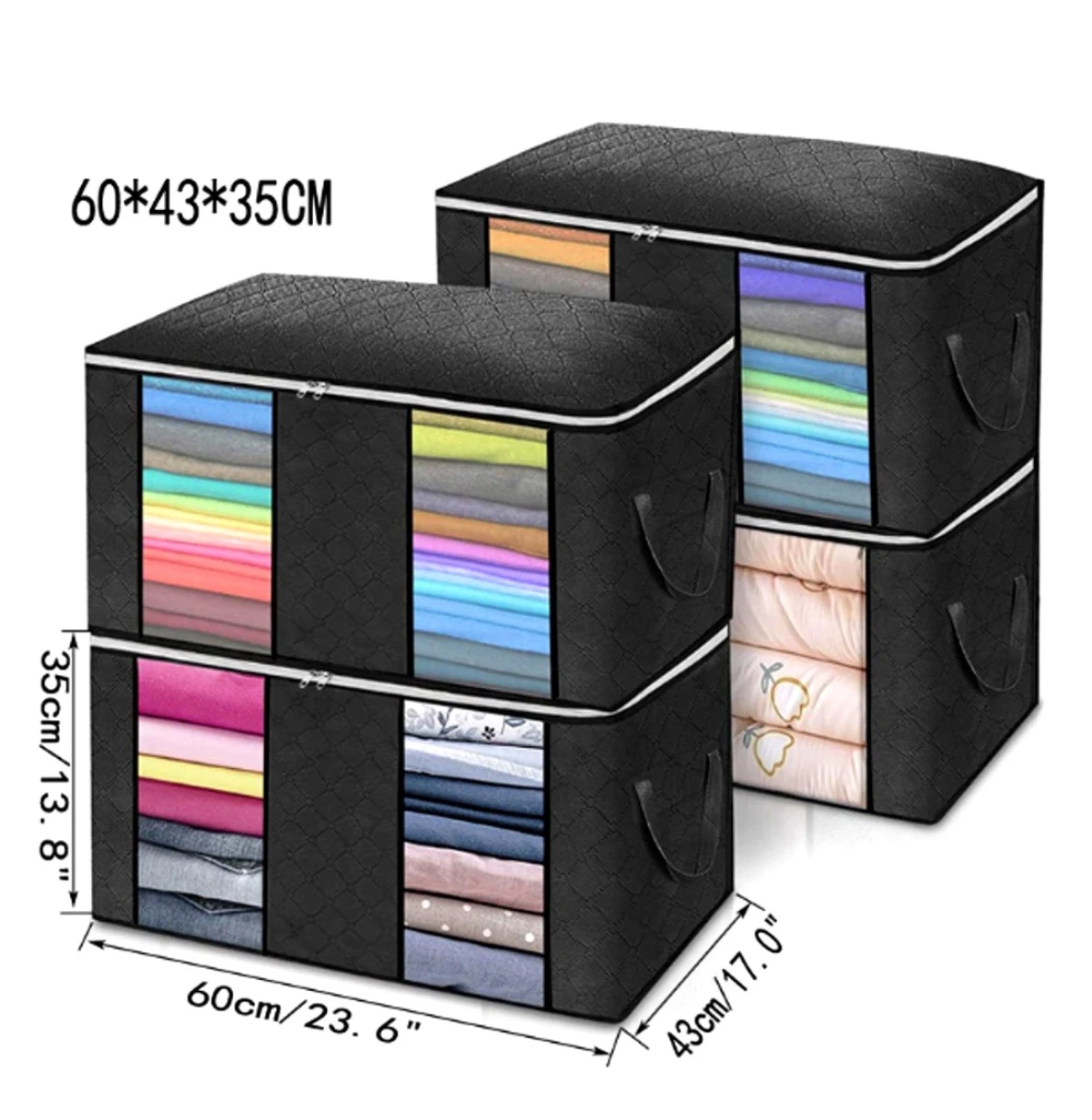 Organizatoarele de acest tip, stivuite unul peste altul, pot fi amplasate în dulap și reprezintă o alternativă la dulapul clasic. Sacul organizator de garderobă pentru pături lenjerie de pat are dimensiunile: 60 cm x 43 cm x 35 cm.