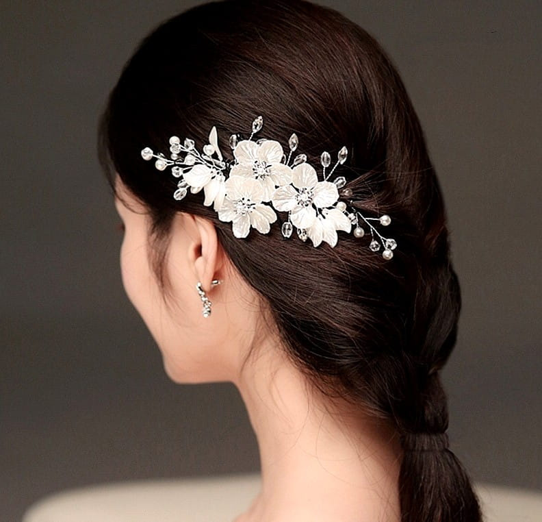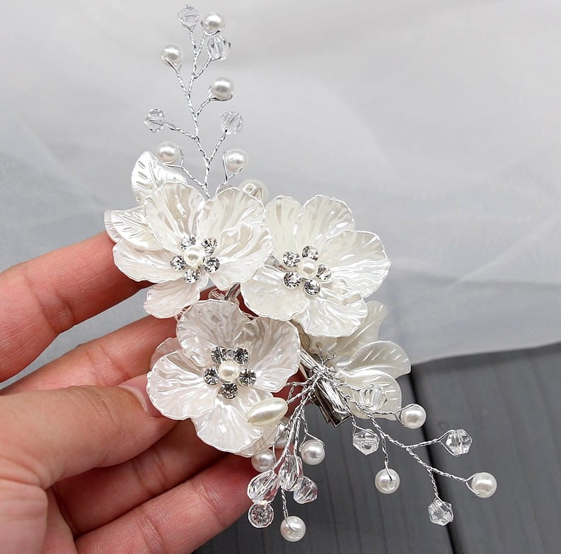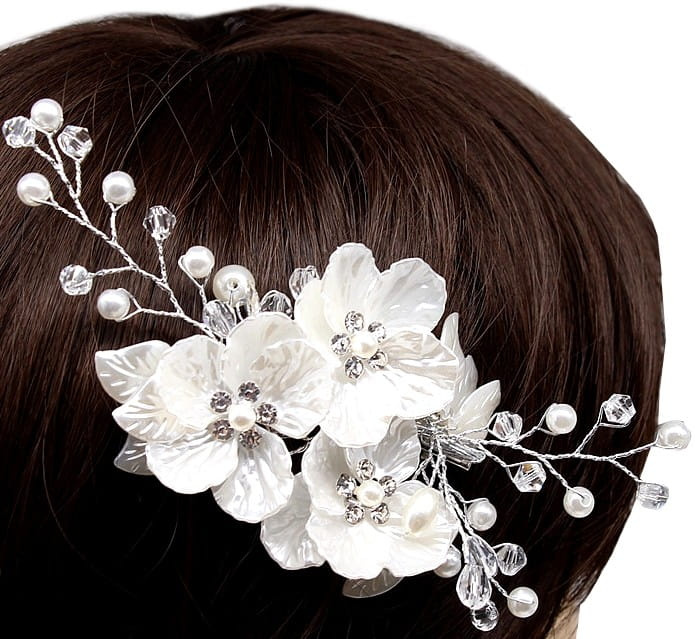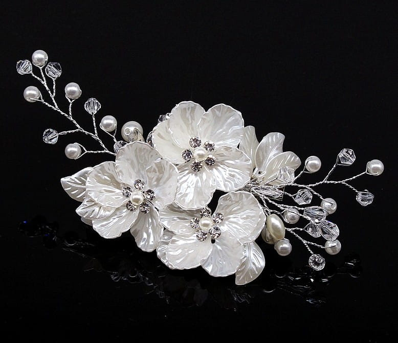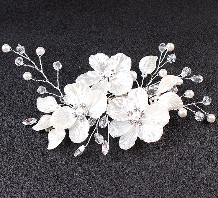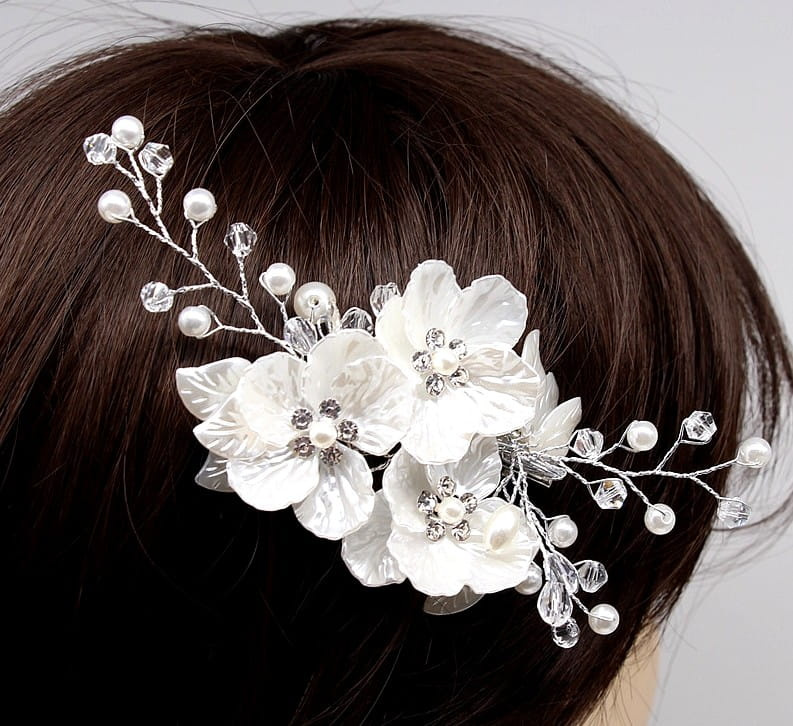Pieptene de argint pentru nunta, decor par, flori, perle