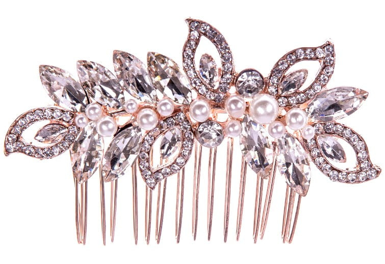 ✅ Culoarea roz auriu (rose gold) a pieptenelui, ca în imagine, adaugă o notă chic și glamour, făcându-l alegerea perfectă pentru mireasa modernă care apreciază eleganța cu o notă de romantism.