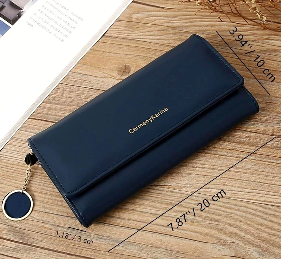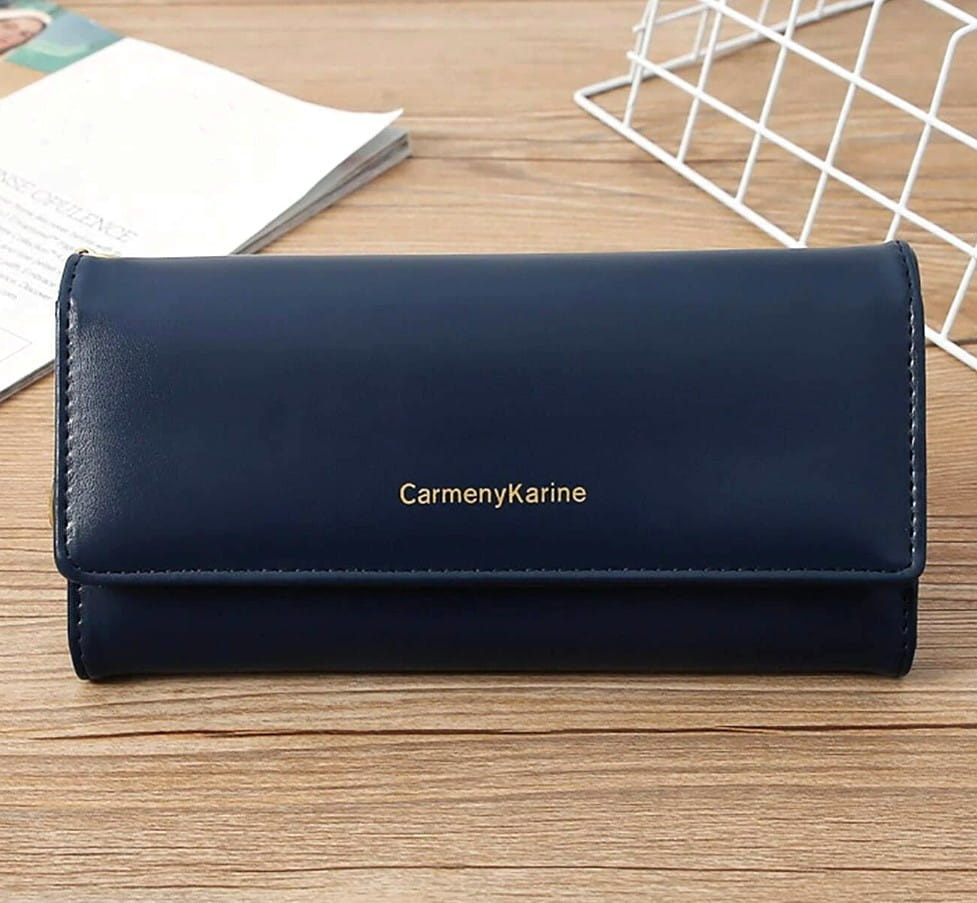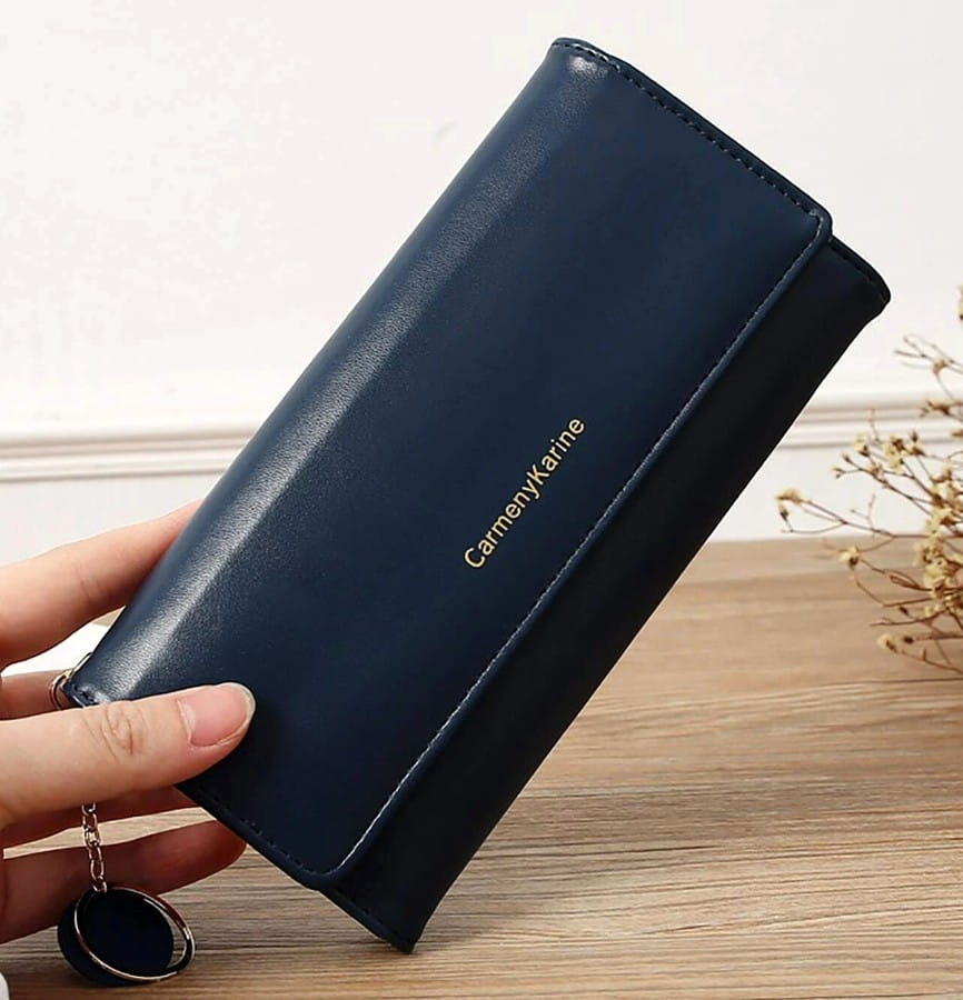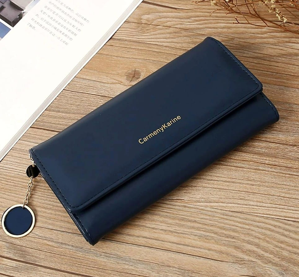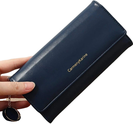 Frumosul și marele portofel pentru doamne din piele albastru marin cu breloc este o piesă minunată de mercerie. Acest portmoneu de damă este decorat cu inscripția Carmen Karine, plasată într-o poziție centrală. Acesta este un detaliu care contribuie la aspectul izbitor al produsului nostru recomandat.