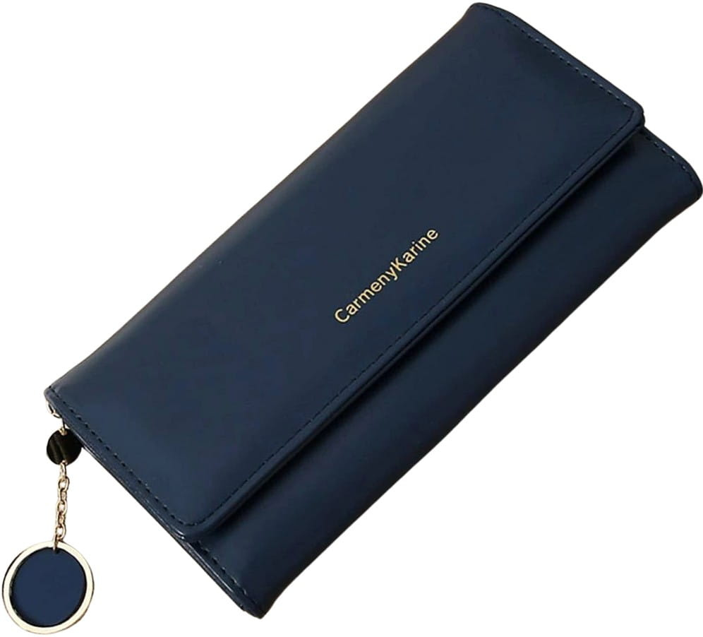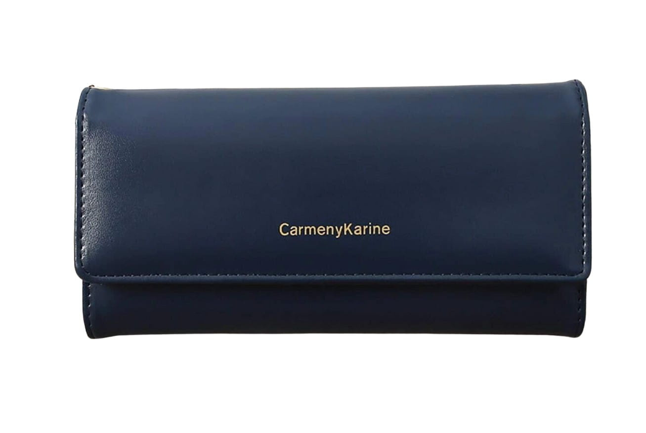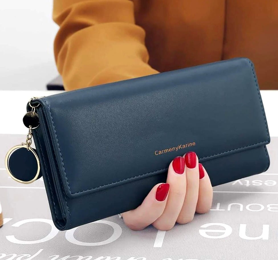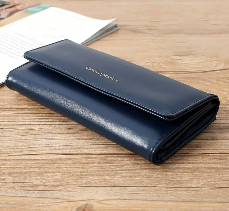 Frumosul și marele portofel pentru doamne din piele albastru marin cu breloc este o piesă minunată de mercerie. Acest portmoneu de damă este decorat cu inscripția Carmen Karine, plasată într-o poziție centrală. Acesta este un detaliu care contribuie la aspectul izbitor al produsului nostru recomandat.