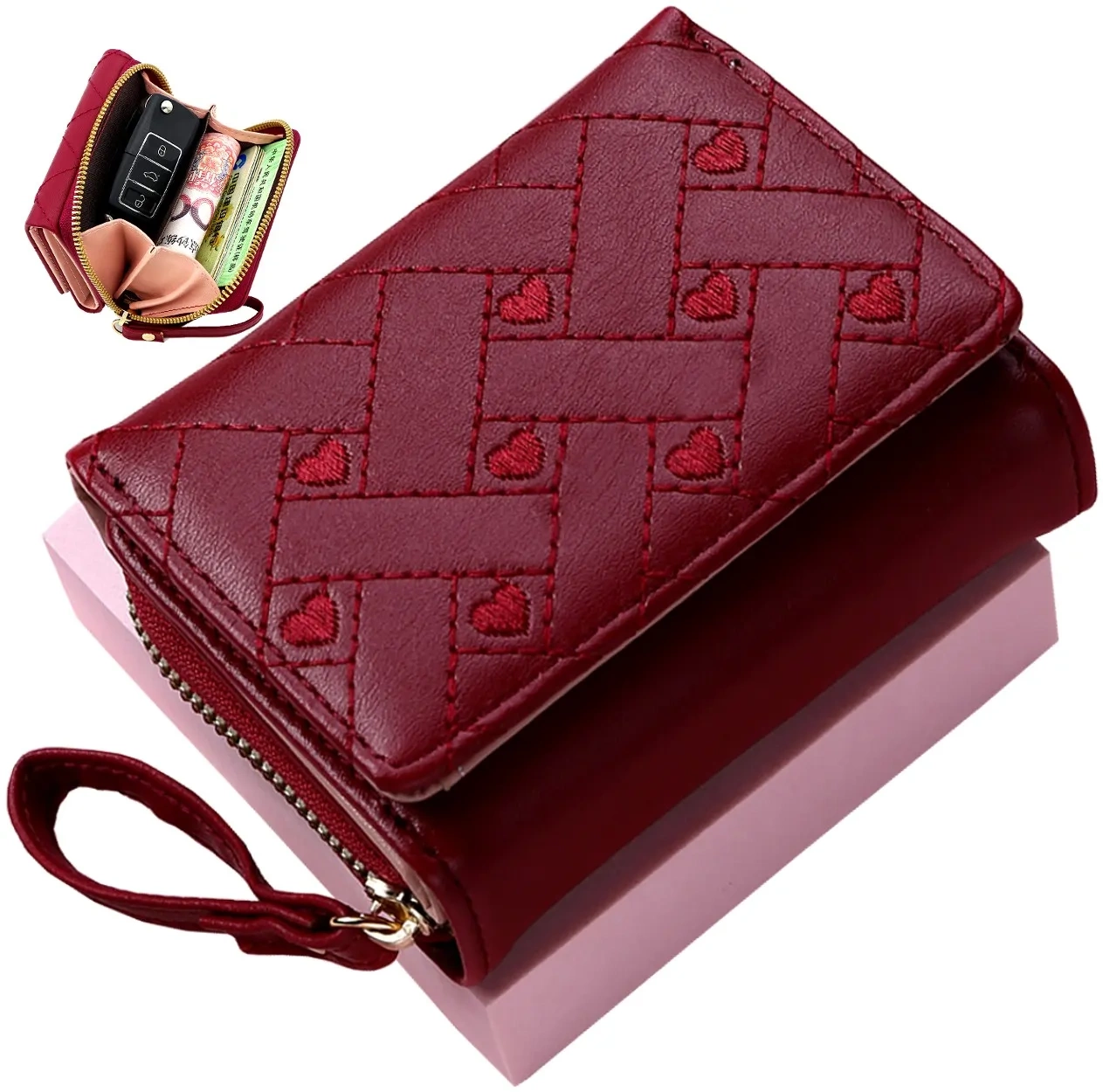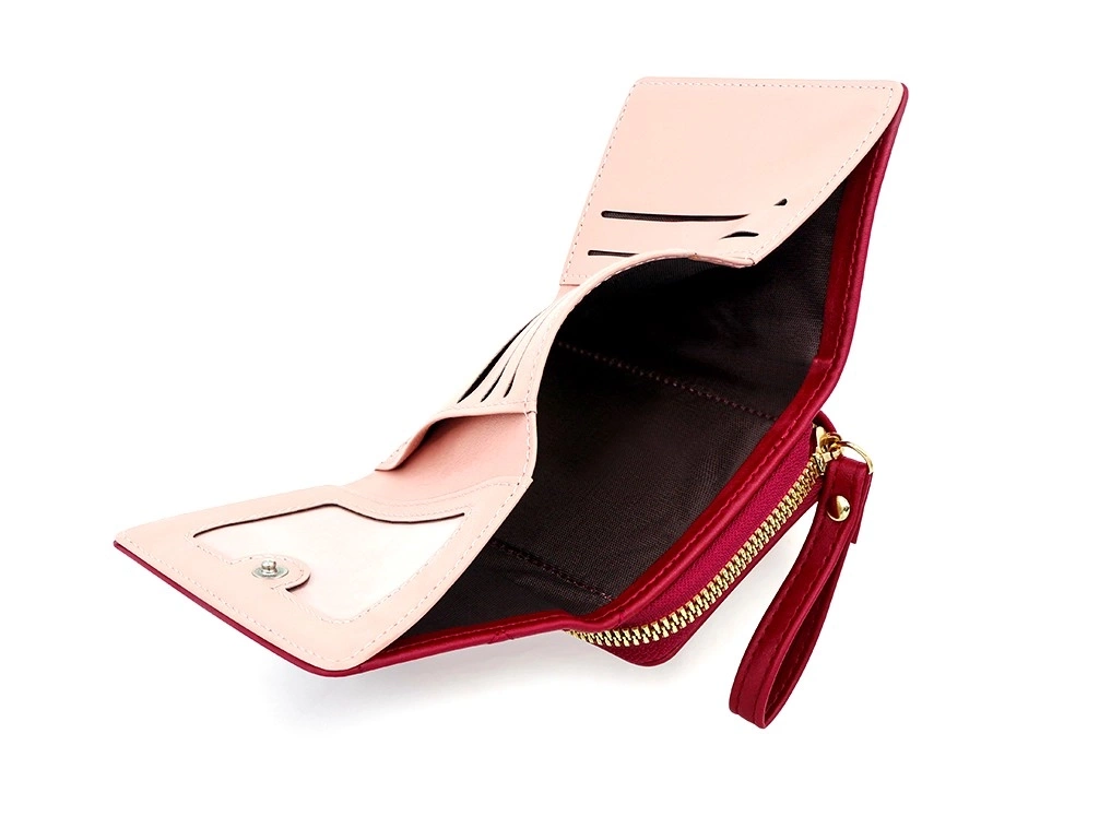 Motivul original de pe partea de sus adaugă farmecului său unic. Motivul este decorat cu inimioare de dimensiuni mici, brodate la mașină. Portofelul clasic pentru femei recomandat de noi, cu poșetă cu inimioare, este fabricat din piele ecologică foarte rezistentă și durabilă.