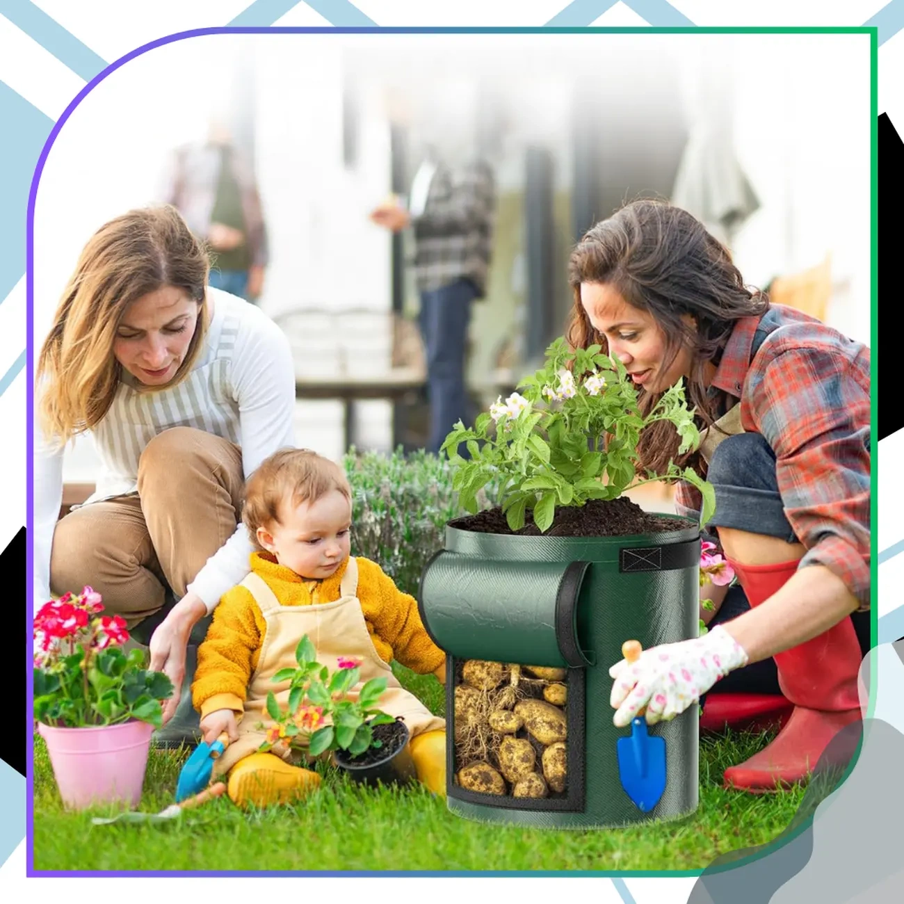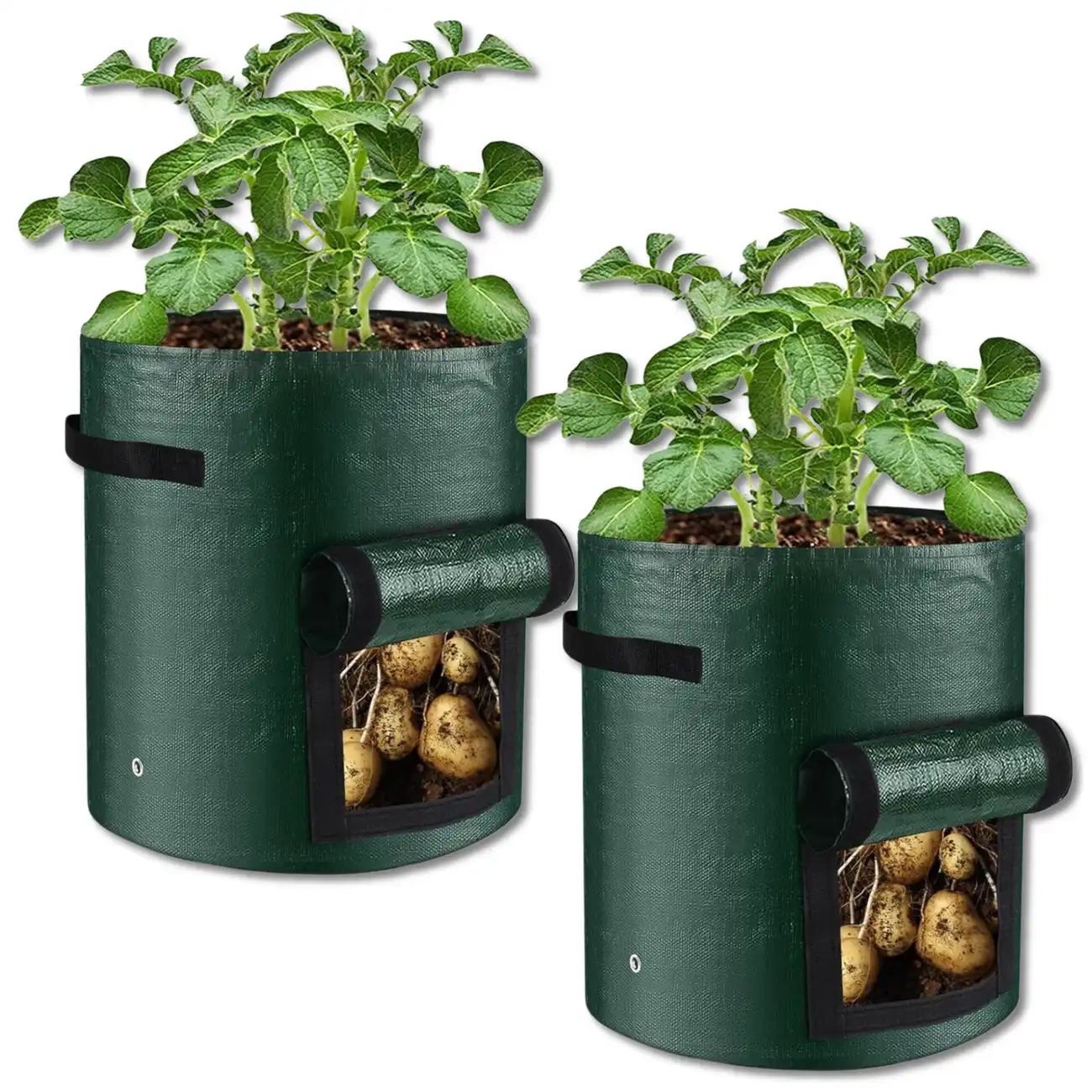 Oferim saci noi, de înaltă calitate, saci de plantat de cartofi și legume, cu o capacitate de 7 galoane (aprox. 26 litri), din material PE ecologic. Setul include 2 saci de cultivare verzi, ideali pentru gradina, terasa, balcon sau chiar acasa. Aceasta este o soluție practică și estetică pentru fiecare iubitor de cultivarea legumelor acasă.