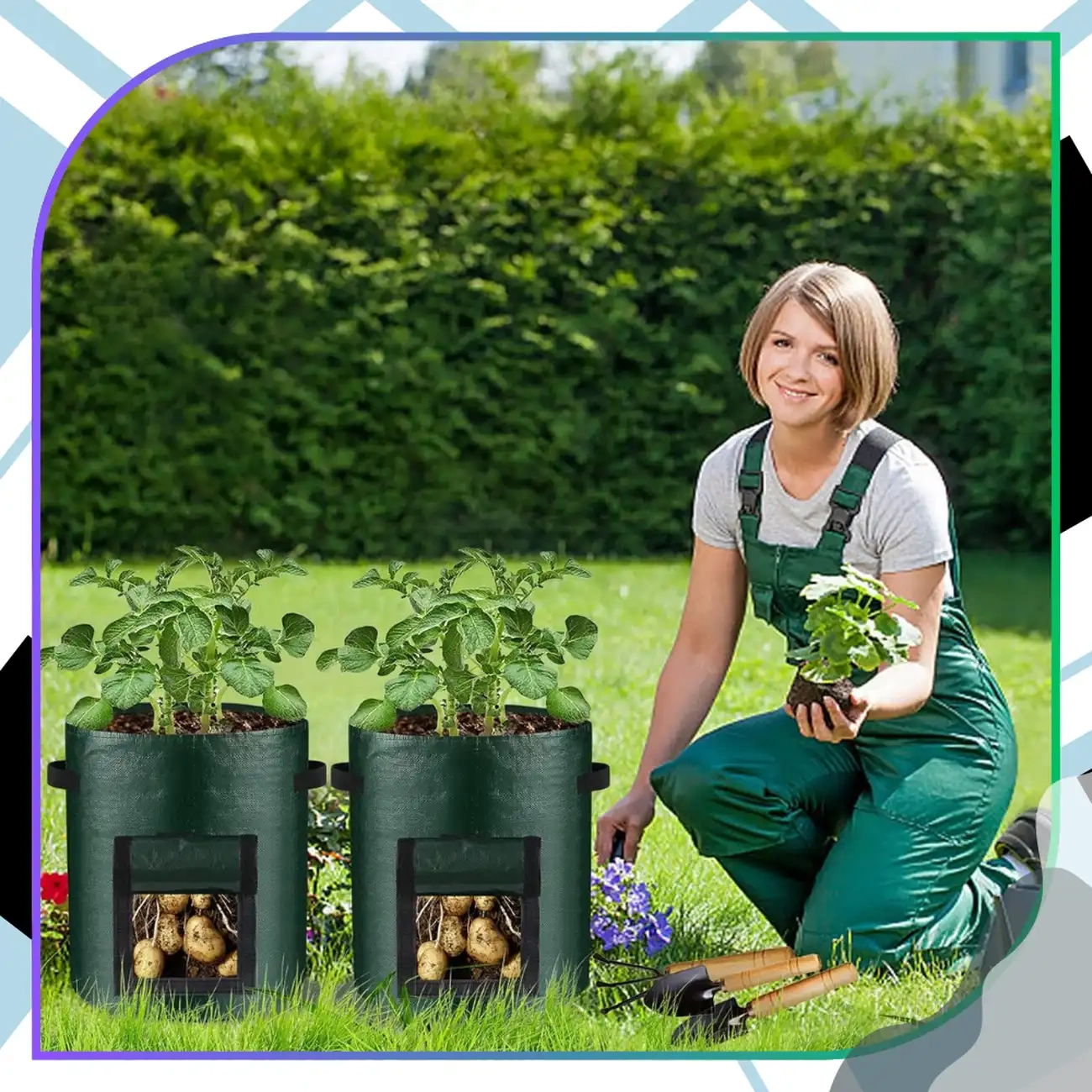 Acești pungi de grădină mobile sunt potriviti pentru plantarea de cartofi, ceapă, morcovi, ridichi, căpșuni, ierburi (mentă, rozmarin) și plante ornamentale. De asemenea, pot fi folosite ca pungi de depozitare practice în extrasezon.