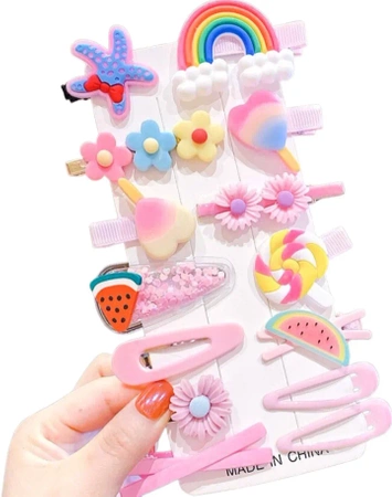 Setul propus de ace de păr pentru copii 14 buc. este decorat cu detalii amuzante sub forma unei bucăți de pepene, a unui curcubeu, a unei acadele, a unor flori sau a unei stele de mare. Setul include agrafe de păr slip-on și snap-on. Această selecție de produse vă permite să experimentați cu diferite coafuri, ceea ce cu siguranță îi va plăcea fetiței dvs. elegante.